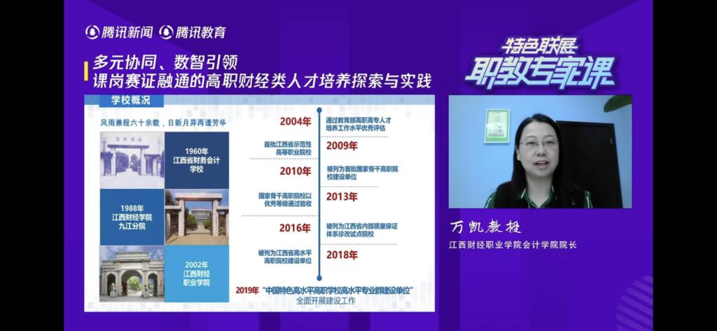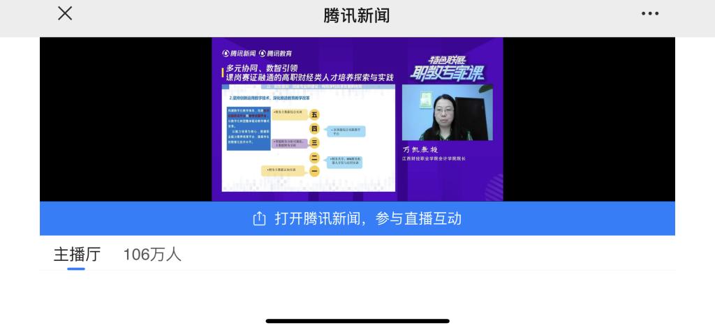 4月25日,会计学院院长万凯受邀参加腾讯新闻《职教专家课》直播讲座,讲座以《多元协同、数智引领、课岗赛证融通的高职财经类人才培养探索与实践》为主题,分享了beat365官网职业教育改革成果与典型经验,介绍了学校概况及特色培育。整场课程直播的在线收看人数高达106万人次。