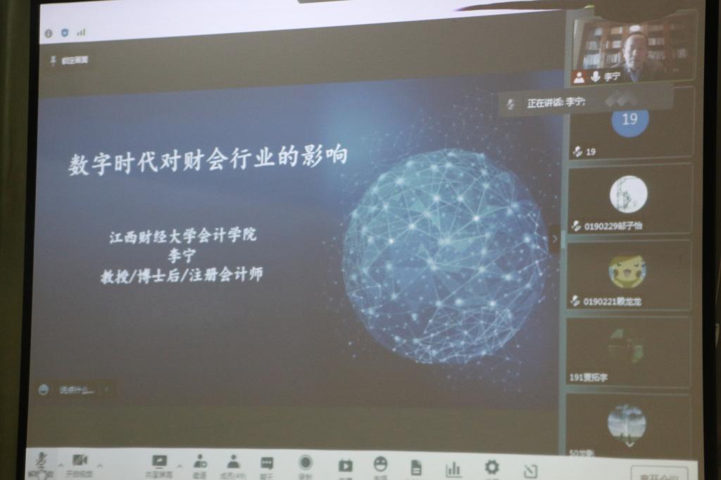 为使同学们加深对所学专业的认识,明确专业发展方向,了解大数据时代下会计行业的发展前景,2022年4月22日,本科部邀请江西财经大学会计学院副院长李宁教授为大家讲授题为《数字时代对财会行业影响》的会计学科前沿讲座。因为疫情影响,本次讲座通过腾讯会议进行,本科部19级职教本科班同学和部分教师线上参会。