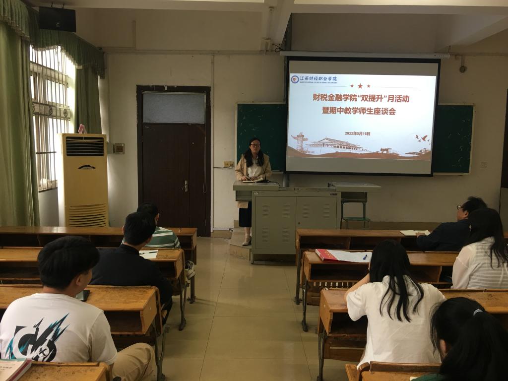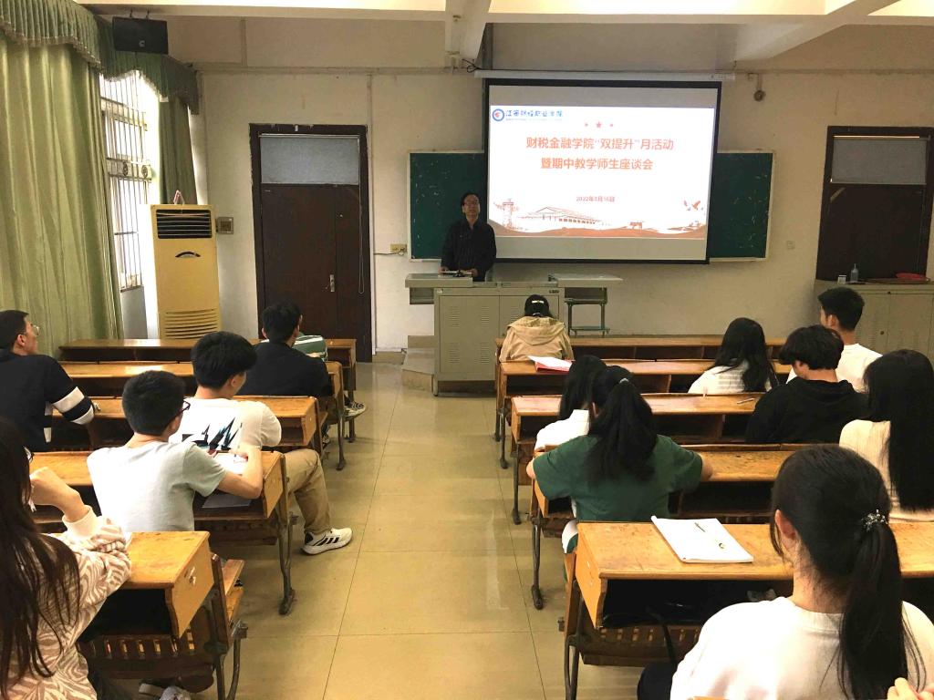 为加强师生交流互动,全面提升学院教学质量和学生素质,2022年5月16日,财税金融学院在综阶1室举办“双提升”月活动暨期中教学师生座谈会。学院领导、各教研室主任和20级、21级各班学生代表共50余人参加活动。活动由学院党政办公室主任张天明主持。