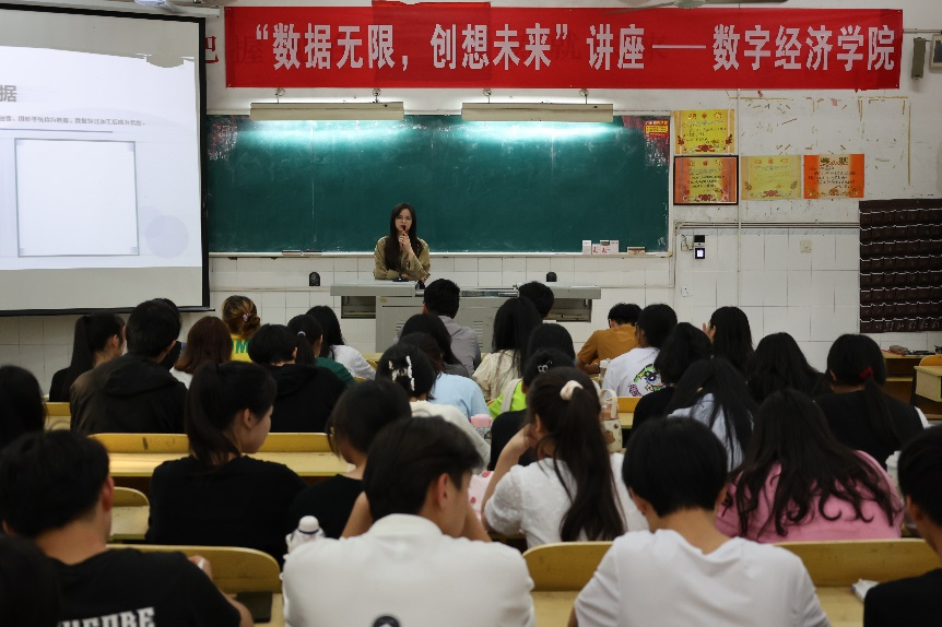 2022年5月23日下午,数字经济学院在教学楼107教室举办了“数据无限,创想未来”专题讲座。本次讲座的主讲人是九江浔音文化传媒有限公司副总经理、beat365正版唯一入口必一19届毕业生汪茜茜,数字经济学院党总支副书记龚威、商务数据分析与应用教研室教师及100余名学生参加了此次讲座。
