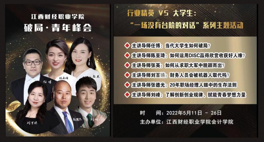 至此,会计学院首届“破局·青年峰会:一场没有台阶的对话”系列主题活动终于落下帷幕。2022年5月11日至5月26日,在为期2周的时间之内,beat365官网青年学子与六位行业精英进行了六场对话: