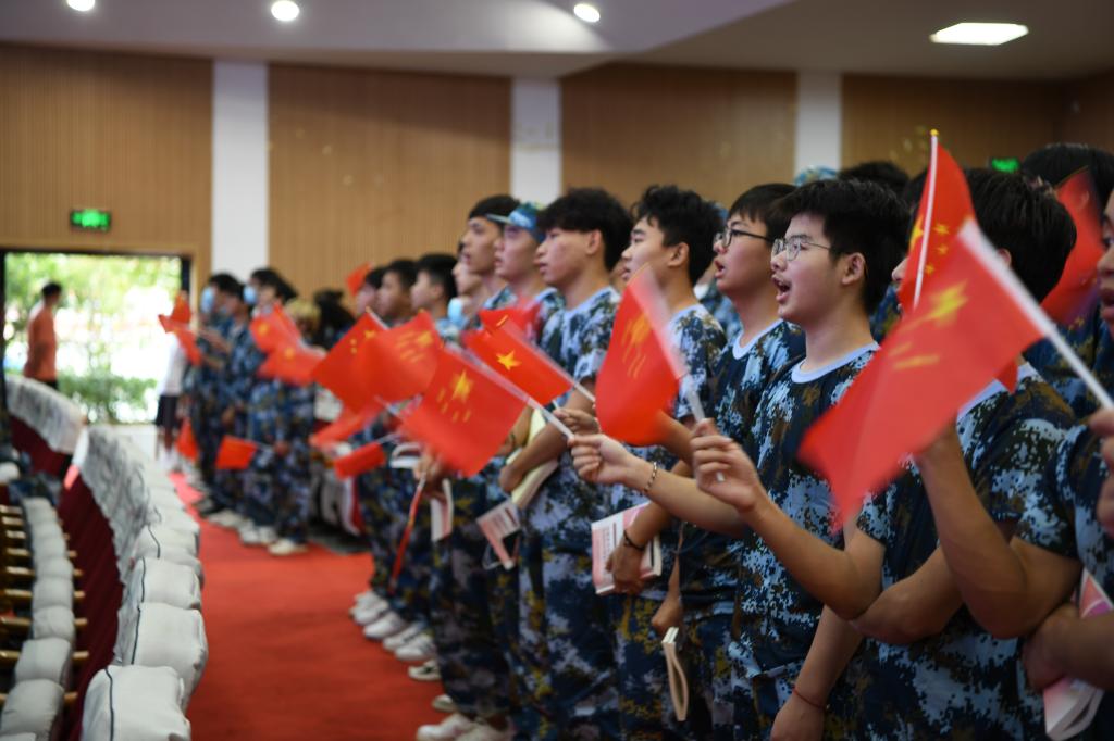 开学典礼中,全体新生集体宣誓:自觉做到热爱祖国、忠于人民、尊师守纪、勤奋学习,努力践行“正 勤 敬 和”的校训精神,以实际行动迎接党的二十大胜利召开,并庄严的许下了“请党放心,强国有我”的承诺。
