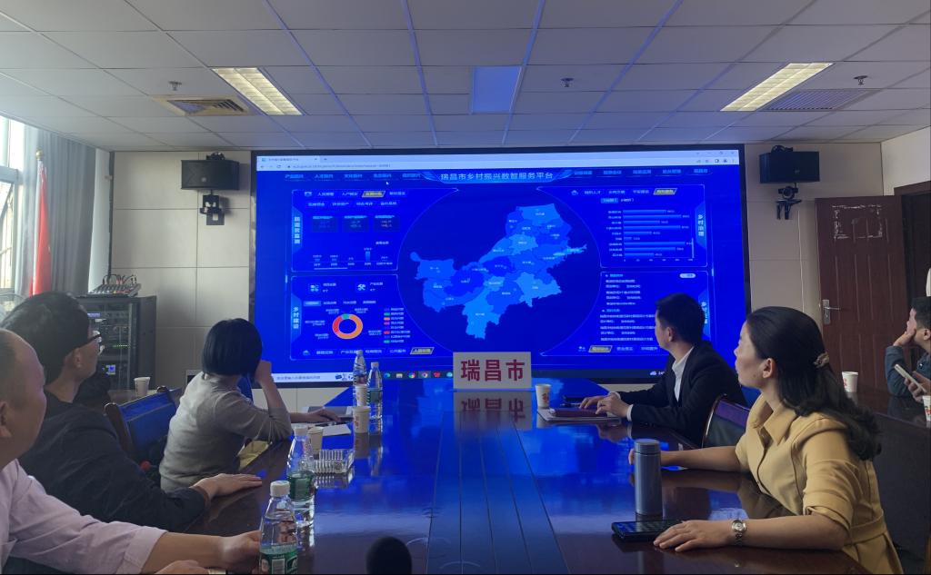 瑞昌市乡村振兴局局长曹名娥对江西省九江市都昌县县委常委江和通一行表示热烈欢迎,并介绍了瑞昌市“数字乡村”建设整体发展规划。乡村振兴推进办主任李小卫详细讲解了瑞昌市乡村振兴数智服务平台的搭建思路,并现场演示了试点村镇平台的实际运营情况。该平台包括五大场景(产业振兴、人才振兴、文化振兴、生态振兴、组织振兴)和四大模块(防返贫检测、数字建设、数字治理及数字发展)。双方就瑞昌市乡村振兴数智服务平台的建设进行了深入研讨。