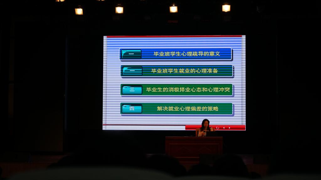 王美娟老师主要围绕毕业班学生心理疏导的意义、毕业班学生就业的心理准备、毕业生的消极择业心态和心理冲突、解决就业心理偏差的策略四个方面内容给2023届毕业生作了精彩讲座。王美娟老师总结了同学们在面临就业问题上可能会出现的主要心理冲突与就业心理误区,鼓励学生要进行正确的自我认知、职业认识与评价,培育职业素养,树立正确的就业择业观,掌握心理调适与心理自助的方法技巧。