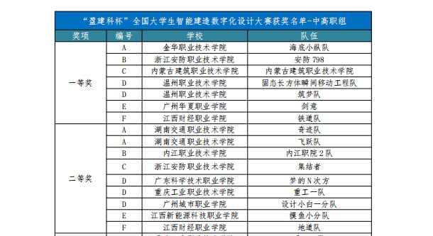 由中国建设教育协会主办,廊坊市中科建筑产业化创新研究中心、北京盈建科软件股份有限公司协办的“盈建科杯”2022年度全国大学生智能建造数字化设计大赛全国大赛于2022年11月25-27日在线上举行,由beat365官网蔡小萍、张乐老师指导,蔡永浩、张子康、曹欢欢、缪飞、祝献东五位同学组成的“铁道队”荣获中高职组F赛项机电深化设计团体一等奖,黄钧、周阮可、徐芬英、张子雄、曾学文五位同学组成的“地道队”荣获中高职组F赛项机电深化设计团体二等奖,两位老师荣获“优秀指导教师”称号。