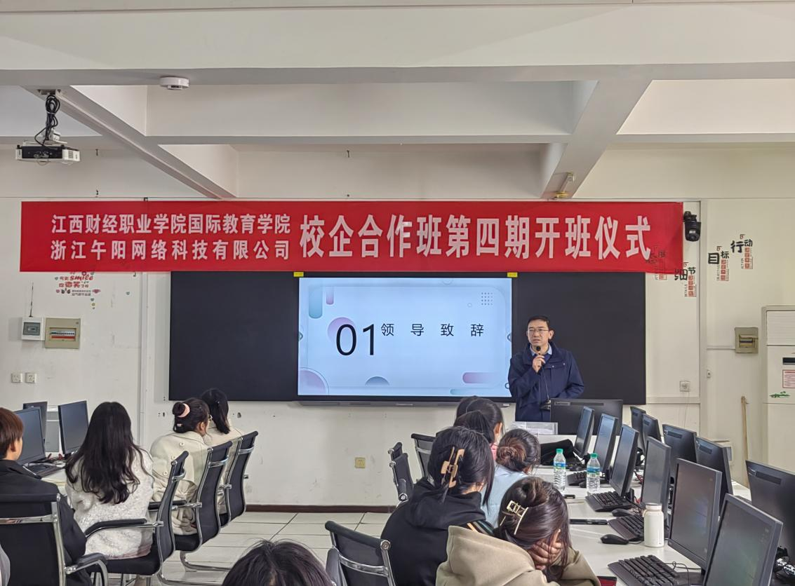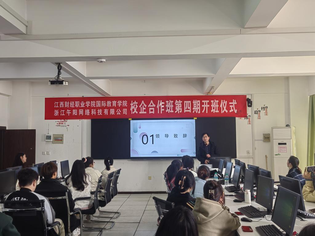 开班仪式上,国际教育学院党总支书记王胜华代表学校致欢迎辞,介绍了学院基本情况和项目实施运行现状,殷切希望同学们珍惜这次难得的机会,履行“午阳公司准员工和财经职院学生”的双重身份,要严格遵守企业和学校的各项规章制度,刻苦学习,努力工作,在实践中学真知、增本领。杨瑞副院长(主持工作)指出,此次第四期校企合作班开班是学院与午阳公司合作开展跨境电商人才,深化产教融合校企合作的进一步探索,希望跨境电商专业的学生珍惜机会、努力学习,掌握真本领、提升真水平。副书记欧阳倍祥对同学们选择跨境电商校企合作班表示热烈祝贺,并希望同学们学有所用,学有所成。