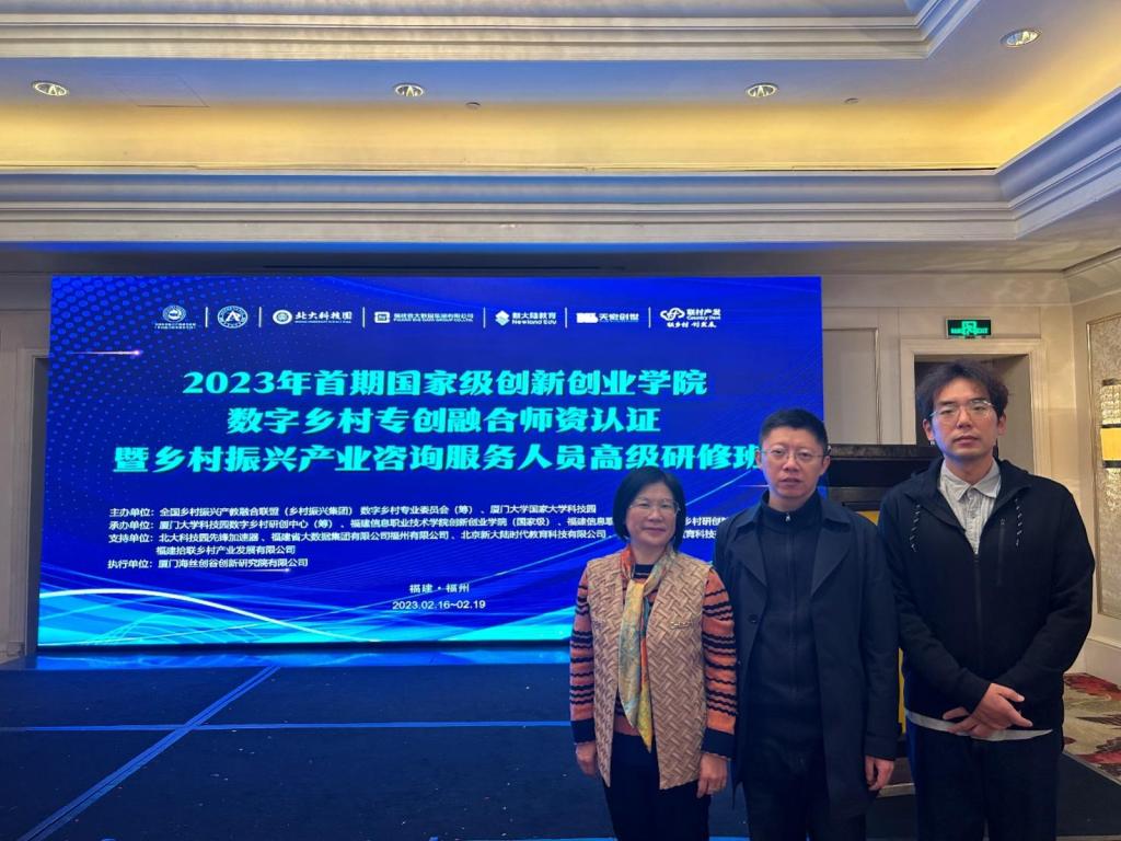 为进一步推进beat365正版唯一入口必一创新创业专项建设工作的开展,促进高校创新创业教师更新教学理念、改进教学方法、提升教育水平,2023年2月18日-19日,beat365正版唯一入口必一数字经济学院副院长谭宏及数字经济专业建设小组章清教授、陈石博士一行赴福州参加首期国家级创新创业学院数字乡村专创融合师资认证暨乡村振兴产业咨询服务人员高级研修班线下培训。