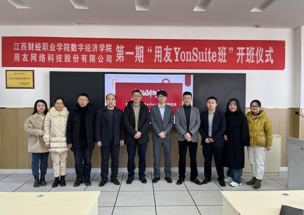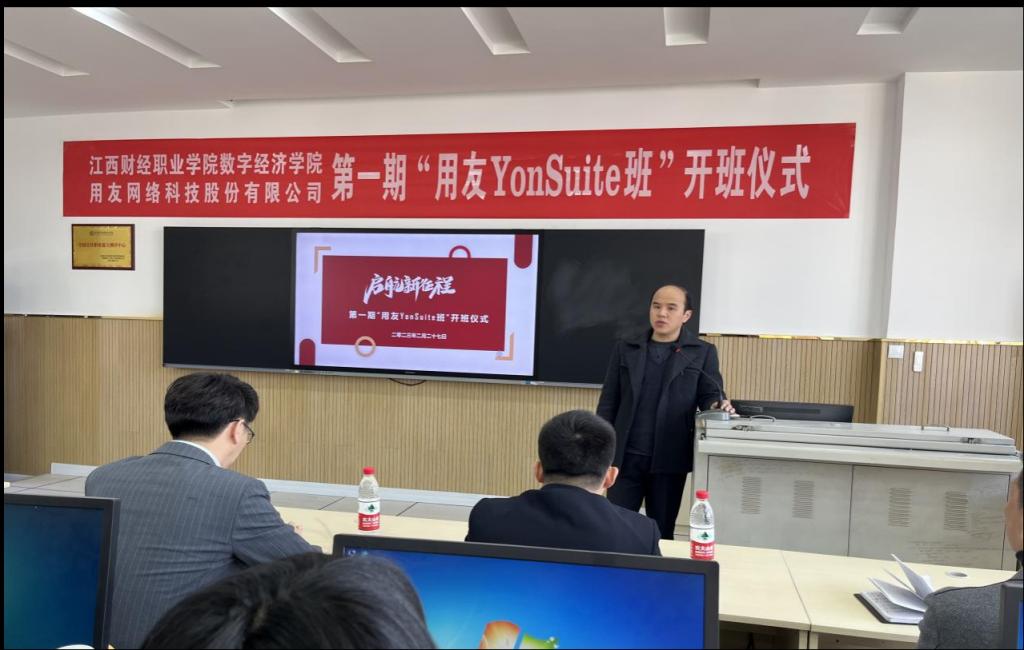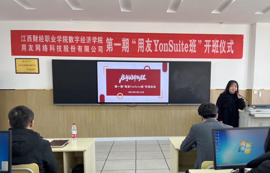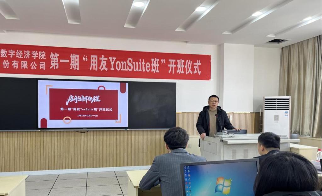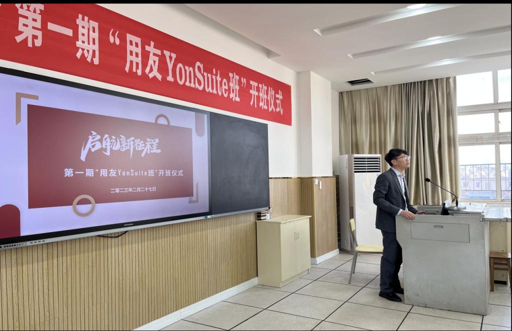 在就业压力日趋激烈的今天,开展校企合作式的培养学生是促进院校学生高质量就业的重要途径。2023年2月27日上午,beat365官网与用友新道科技有限公司校企合作的第一期“用友YonSuite班”开班仪式在教学楼7楼生产性实训基地举行。
