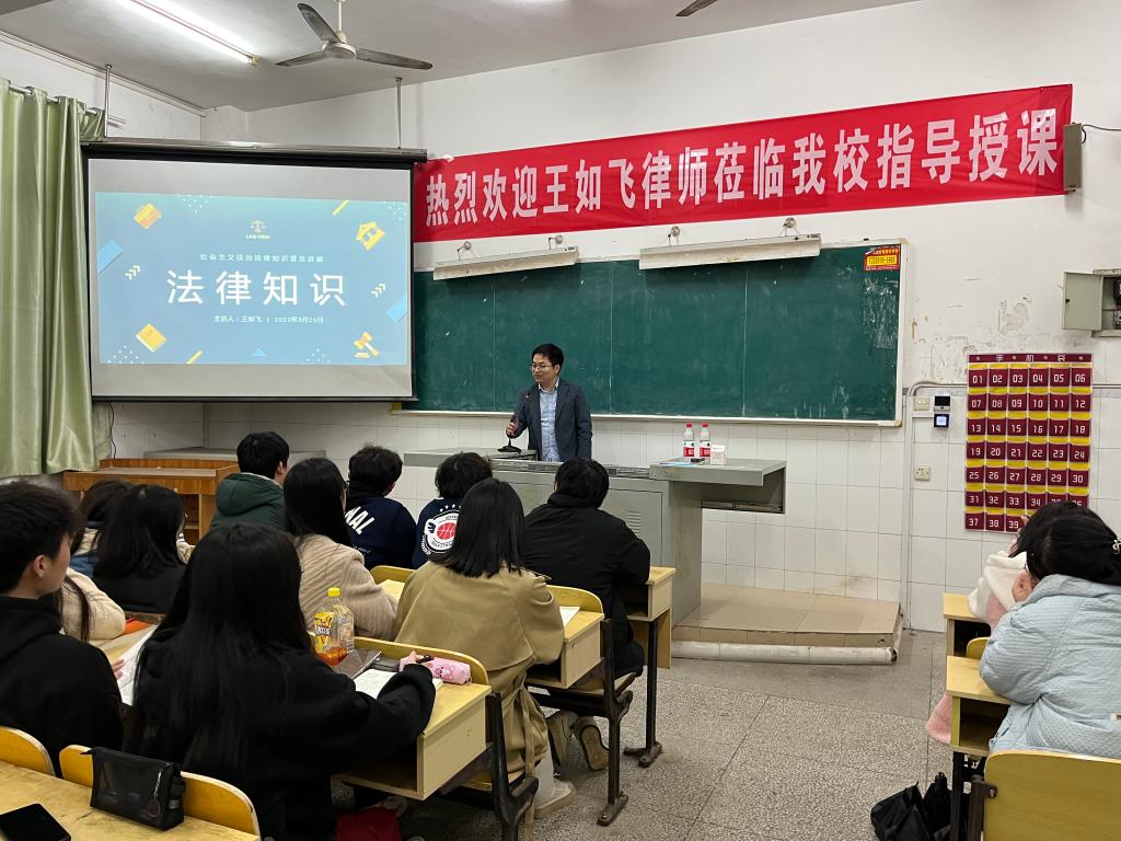 为持续提升beat365官网师生法律知识水平,大力弘扬社会主义法治精神,创建和谐稳定有序的校园环境,3月20日晚,马克思主义学院邀请江西顺合律师事务所王如飞律师在教学楼517以“社会主义法治精神及普法宣传”为主题为全院同学上了一堂生动的法律知识课,万子龙律师陪同参与。讲座由马克思主义学院党总支副书记、副院长熊晓兰主持,马克思主义学院全体学生参加了本次讲座。