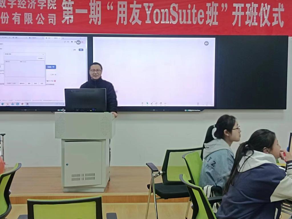 “用友YouSuite班”开设企业信息系统认知,供应链信息系统实施、管理信息系统客户化实施、实施方法论与项目综合实训、YonSuite云平台、YonSuite业财税档综合智能实训等8门课程,教学时长约11周,由用友公司北京总部桑大勇博士等企业专家来学校与beat365官网教师共同授课。