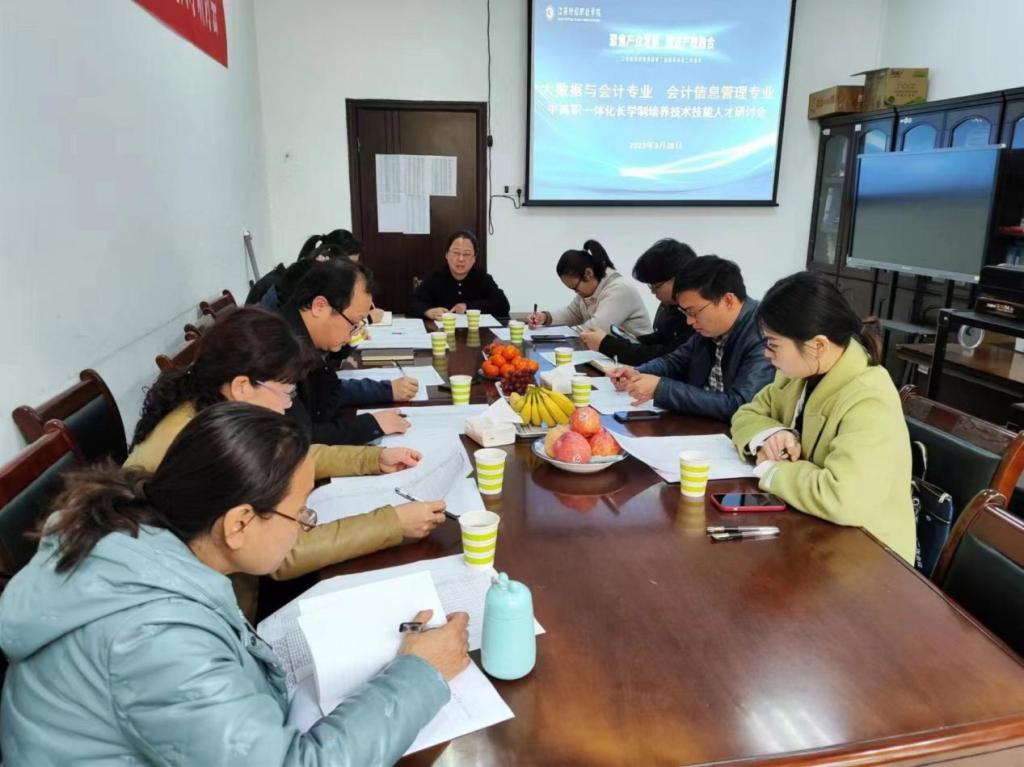 为加强中高职衔接,畅通人才成长渠道,全面提升高素质技术技能人才培养质量,3月28日下午,会计学院组织对口专业中职院校开展中高职一体化长学制培养技术技能人才研讨会。来自赣州应用技术职业学院、贵溪市职业中学、江西省井冈山经贸学校和彭泽县旅游工业中等专科学校的领导老师和会计学院教学领导班子齐聚一堂,共同就“中高职一体化人才培养以及大数据与会计、会计信息管理两个专业的课程体系设计”进行交流研讨。