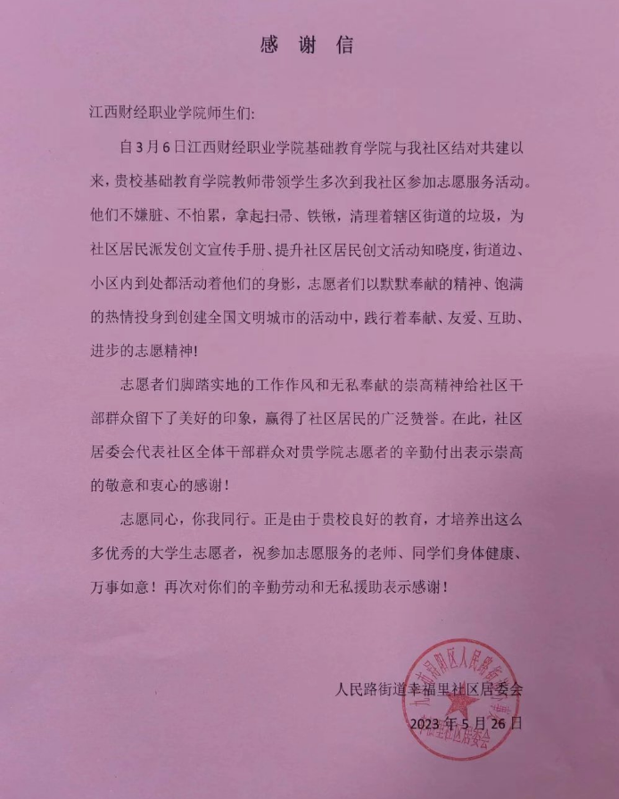 5月26日,基础教育学院志愿服务队收到来自结对共建人民路街道幸福里社区的一封感谢信,对基础教育学院青年志愿者积极服务社区工作表示感谢,对志愿者的服务精神及认真负责的工作态度给予了高度赞扬。