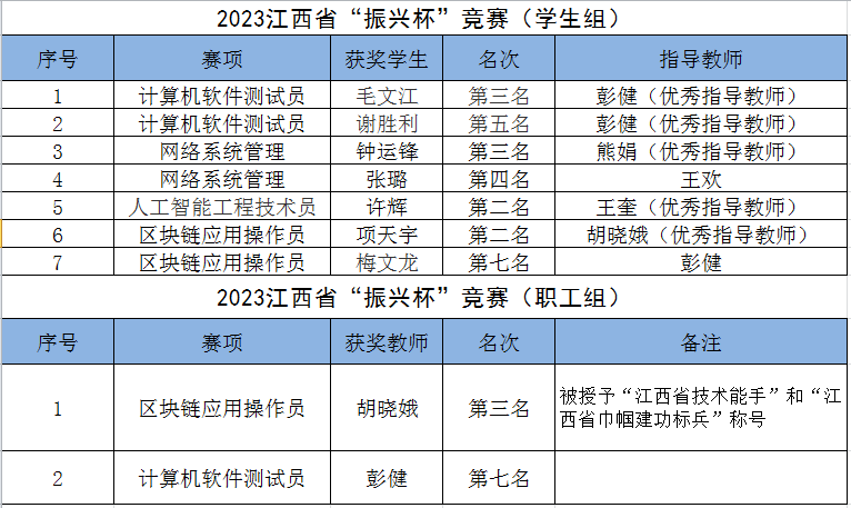近期,2023年江西省“振兴杯”职业技能大赛成绩陆续公布。beat365官网信息工程学院多个项目代表队捷报频传,共获得学生组个人赛第二名、第三名、第五名、第七名,职工组个人赛第三名、第七名,其中项天宇同学被授予“江西省技术能手”称号,胡晓娥老师被授予“江西省技术能手”和“江西省巾帼建功标兵”称号。