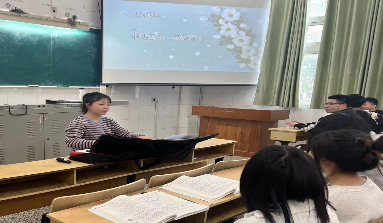 4月26日下午,中文教研室吕相宜老师在教学楼210教室开展《2022年北京冬奥会主题曲—<雪花>赏析》公开课教学。吕老师在音乐上有自己的见解,课堂上语言生动、教态自然,美妙的钢琴声把同学们拉进了课堂,课程从“聆听音乐,感受季节”小游戏环节开始,引导同学感受音乐中的季节变换。以体验感触音乐为主,以情贯穿始终,通过欣赏、讲解和学唱歌曲等教学步骤,将坚韧高洁的奥运精神有机融入了课堂教学中。