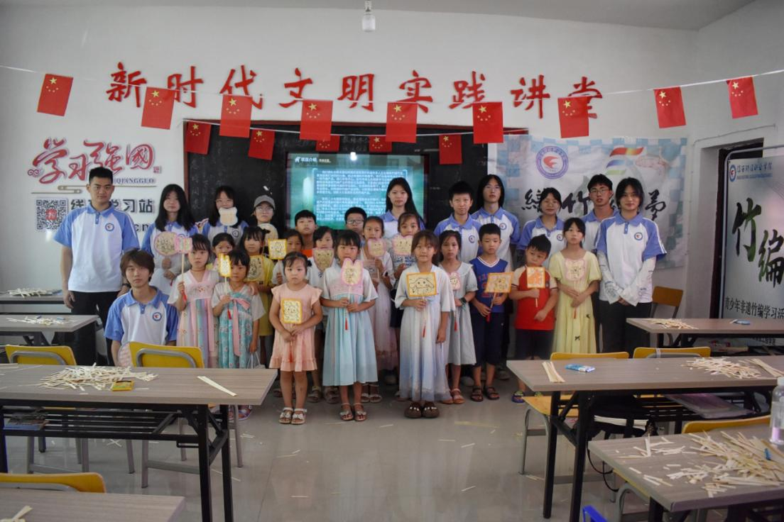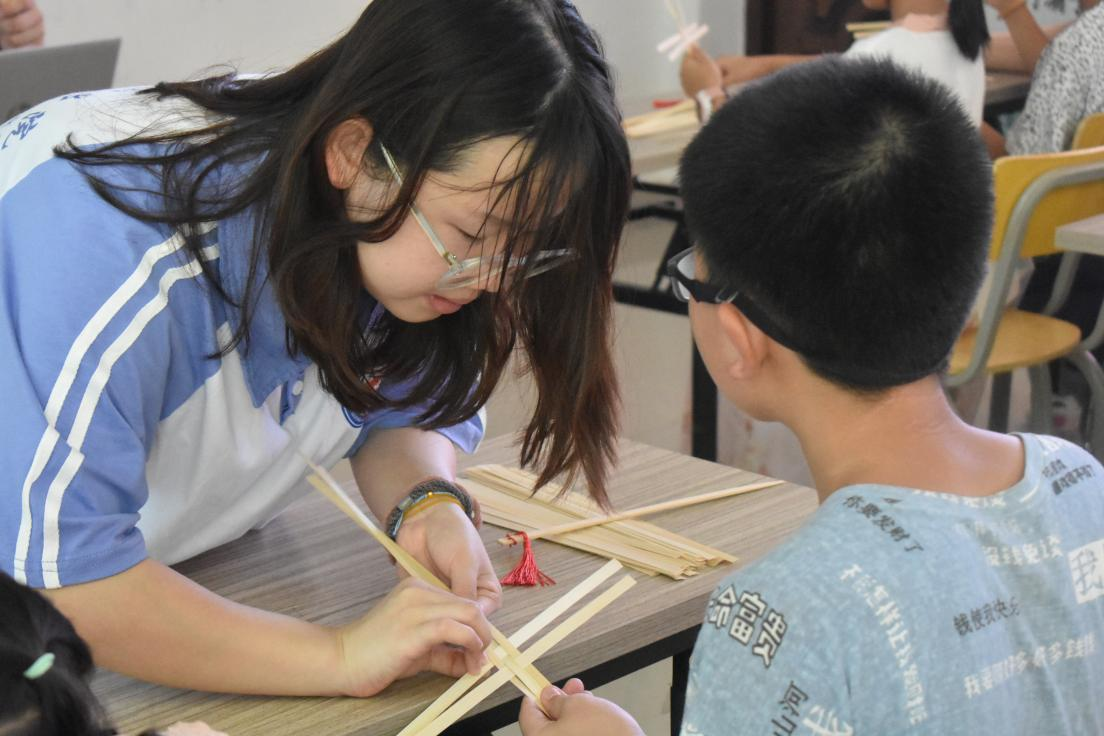 活动第二天,织竹绘梦社会实践队在文化站举行了一场别开生面的手工艺术体验活动,黄仕豪老师以生动有趣的方式向小朋友们介绍了竹编的历史、原理和制作工艺。他通过讲解与实际演示相结合的方式,让孩子们了解到竹编作为中国传统的非遗文化之一,具有悠久的历史和独特的技艺。在活动现场,每位小朋友都获得了一份手工竹编材料包,他们跃跃欲试地打开材料包,团队成员在旁耐心地指导他们如何编织。在编织的过程中,小朋友们互相交流、互相帮助,不仅培养了他们的动手能力和团队合作意识,还增强了孩子们的自信心和创造力。在黄老师的指导下,小朋友们小心翼翼地交叉编织,逐渐展现出自己独特的创意,纷纷制作出了竹扇、竹编小动物等作品,展示出无穷的想象力和创意。