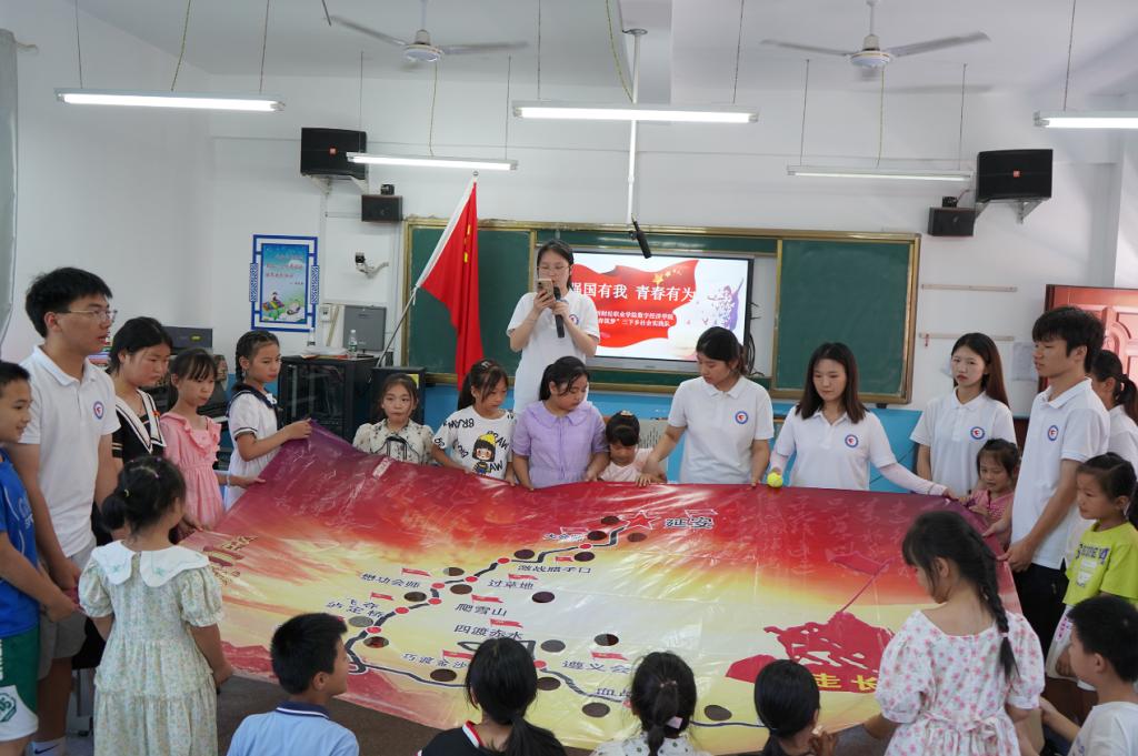 “祖国如有难,汝应作先锋”。中国正是因为拥有无私奉献的先烈,为革命奉献出青春甚至生命,才能铸就今日中国之辉煌。实践队员以“强国有我 青春有为”为主题开展党史教育,带领小朋友诵读红色诗歌、红色家书,讲述英烈故事。最后,实践队员和小朋友们一起“重走长征路”,在寓教于乐中引导少年儿童坚定理想信念,厚植家国情怀,从小听党话、跟党走,努力成长为德智体美劳全面发展的社会主义建设者和接班人。