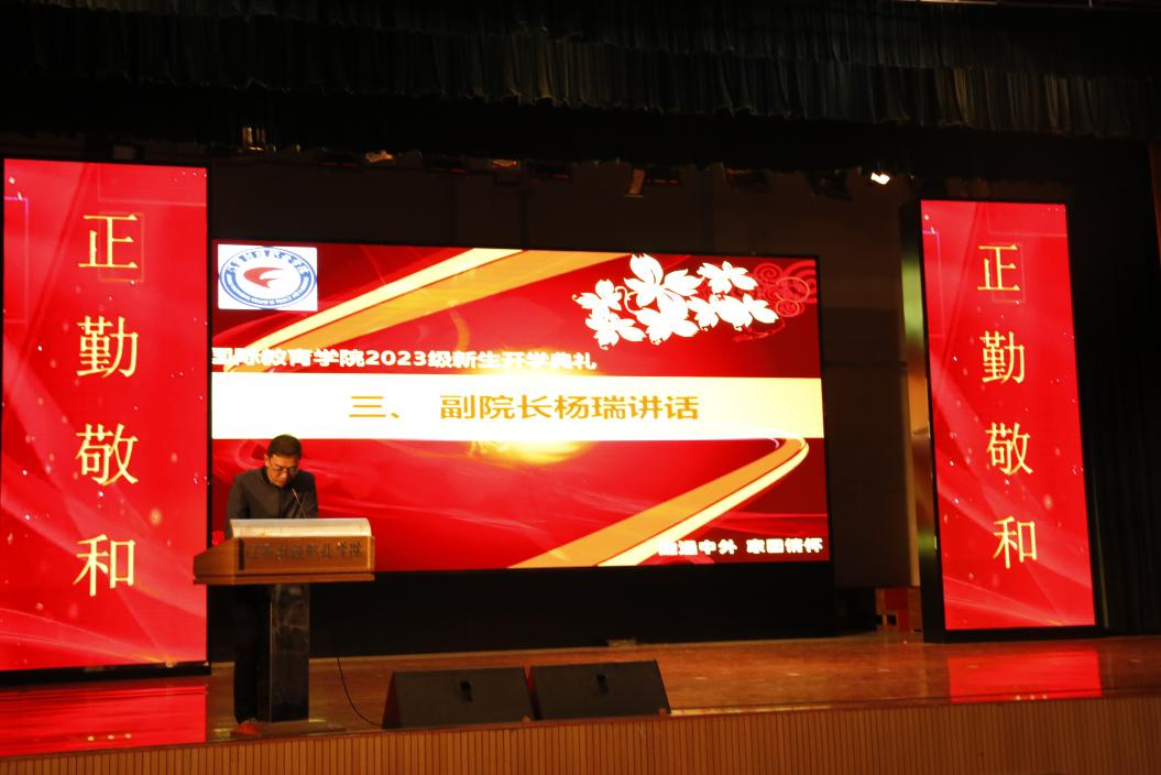 副院长(主持工作)杨瑞介绍了国际教育学院的基本情况、人才培养、师资力量、校企合作和近年来取得的教研成果等,并对新生们提出了三点要求:坚定正确的理想信念,树立正确的世界观、人生观、价值观;营造良好的学习氛围,处理好自己与身边人的关系;培养自主学习能力,把自己的勤奋刻苦与科学的学习方法结合起来。他叮嘱新生们要牢记“正勤敬和”的校训,在未来大学生活里追求全面发展与进步,度过一个快乐、充实、美丽的大学时光。