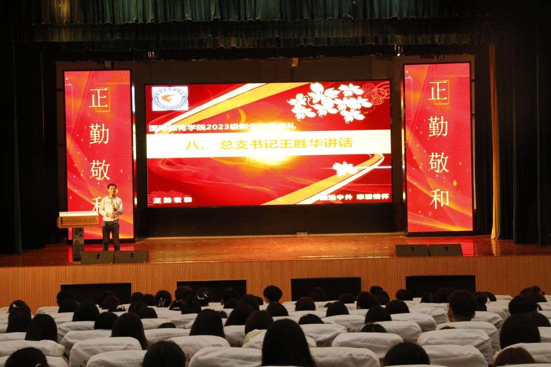 最后,党总支书记王胜华用“感恩、自信、目标、奋斗、坚持和安全”六个关键词寄语全体新生,并对新生提出了殷切希望:一是要有感恩之心,感恩中国共产党,感恩父母、老师和身边的人;二是要树立自信,充分认识自己的优点和长处,勇于面对各种挑战;三是要明确目标,制定合理的学习计划,规划好自己的职业生涯;四是要勇于奋斗,在以后的学习生活中拼搏奋进、力争上游;五是要坚持不懈,做到“咬定青山不放松”;六是要培养安全意识,强化自我保护意识,切实加强防范能力,健康愉快地学习生活。
