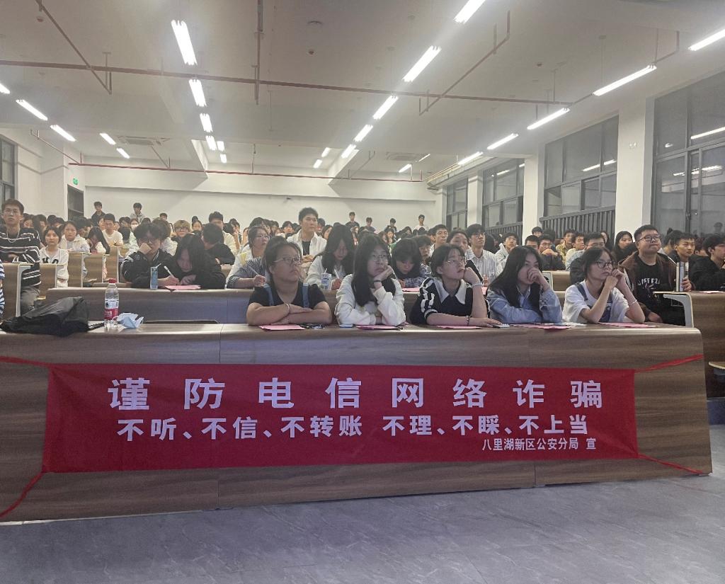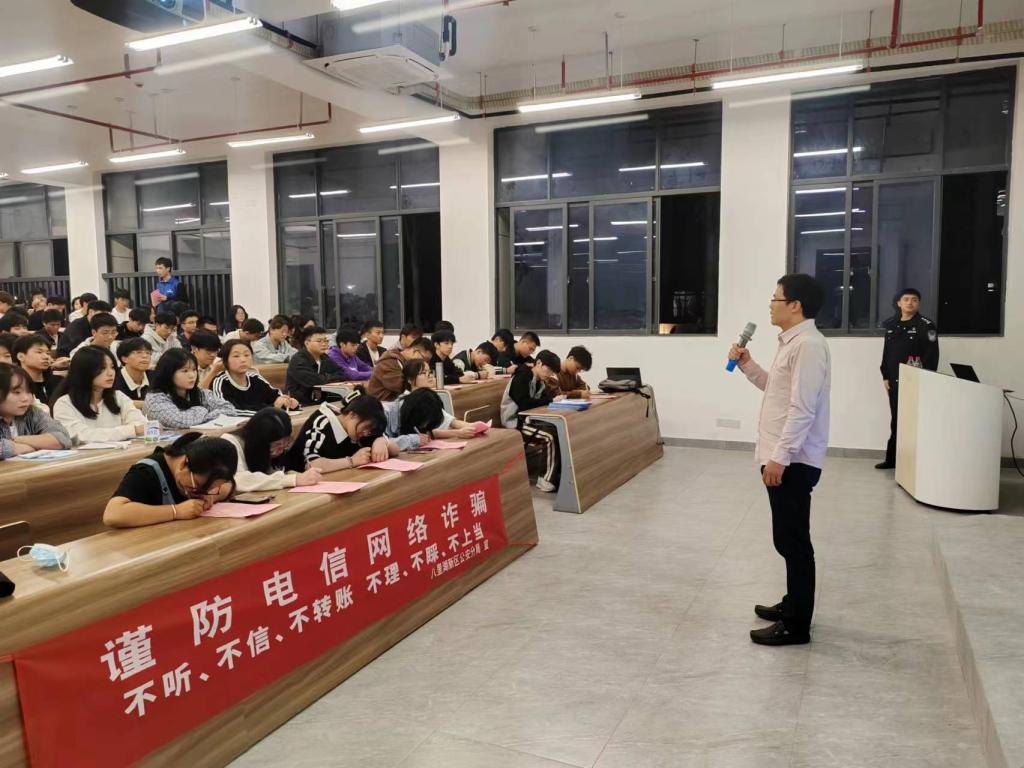 讲座中,陈警官围绕“什么是新型电信网络诈骗”、“最新颖的电信网络诈骗手段”、 “新型电信网络诈骗的危害”、“如何防范电信网络诈骗”等方面进行讲解,结合校园发生的真实案例,深刻剖析了电信网络诈骗的全过程和受害人的心理活动,揭露了诈骗背后的套路和伎俩,为师生敲响了警钟。此外,陈警官还详细讲解了“两卡”犯罪中嫌疑人是如何通过手机卡、银行卡等工具,引诱他人从事洗钱的违法犯罪活动,让师生们深刻认识到“两卡”犯罪的危害性。使学生加深记忆,达到人人识骗的宣传效果。