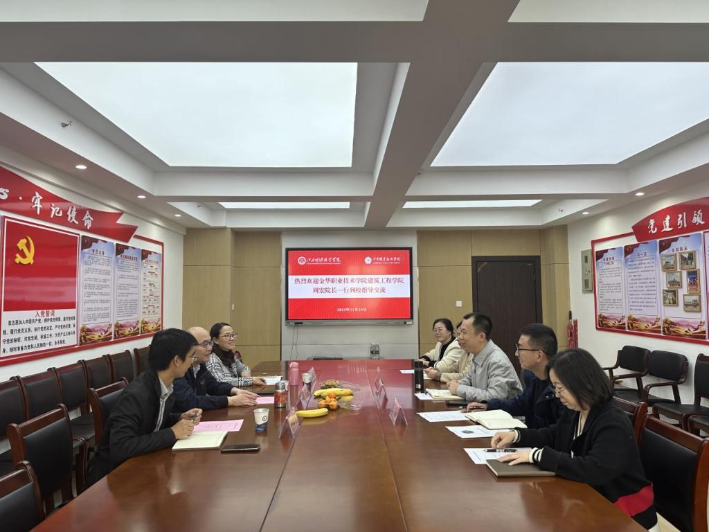 11月23日下午,金华职业技术学院建筑工程学院院长周宏、建筑工程学院工程造价专业副主任刘国平、建筑工程学院工程造价专业教师吴育萍一行来beat365官网调研交专业建设相关工作。城乡建设学院副院长吕亨龙热情接待了周宏一行,双方在综合楼918会议室进行了座谈交流。城乡建设学院副院长张乐、工程管理教研室主任吴翠翠、建筑工程技术教研室主任郭发丽,骨干教师张丽雅等参加了交流座谈。