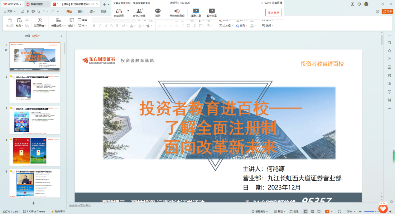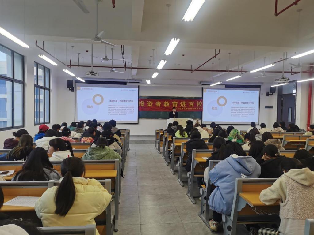 活动伊始,九江营业部讲师何鸿源向同学们介绍了公司基本情况、本次活动的主题和意义。随后,讲师通过生动形象、风趣幽默的方式向同学们讲解了注册制相关知识。