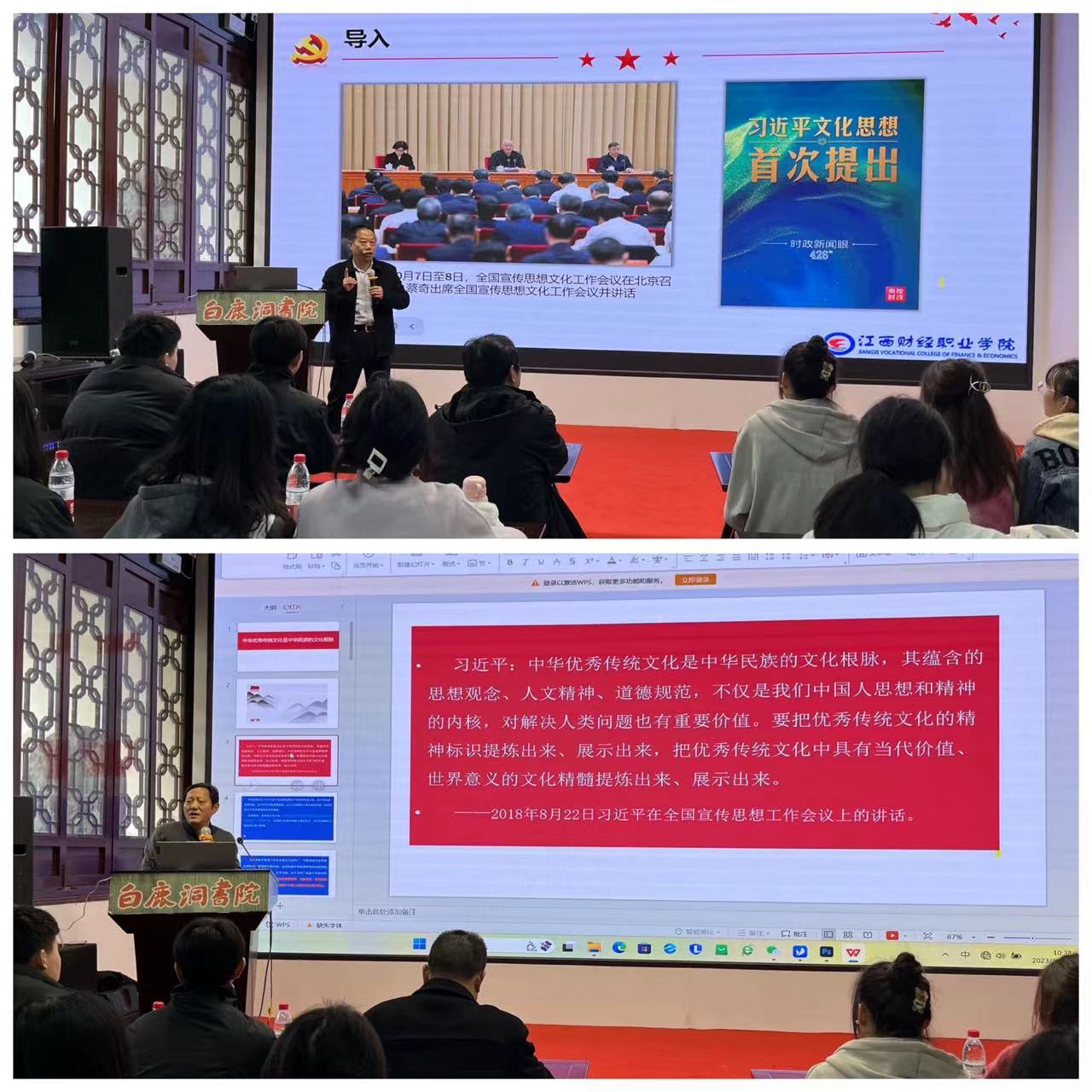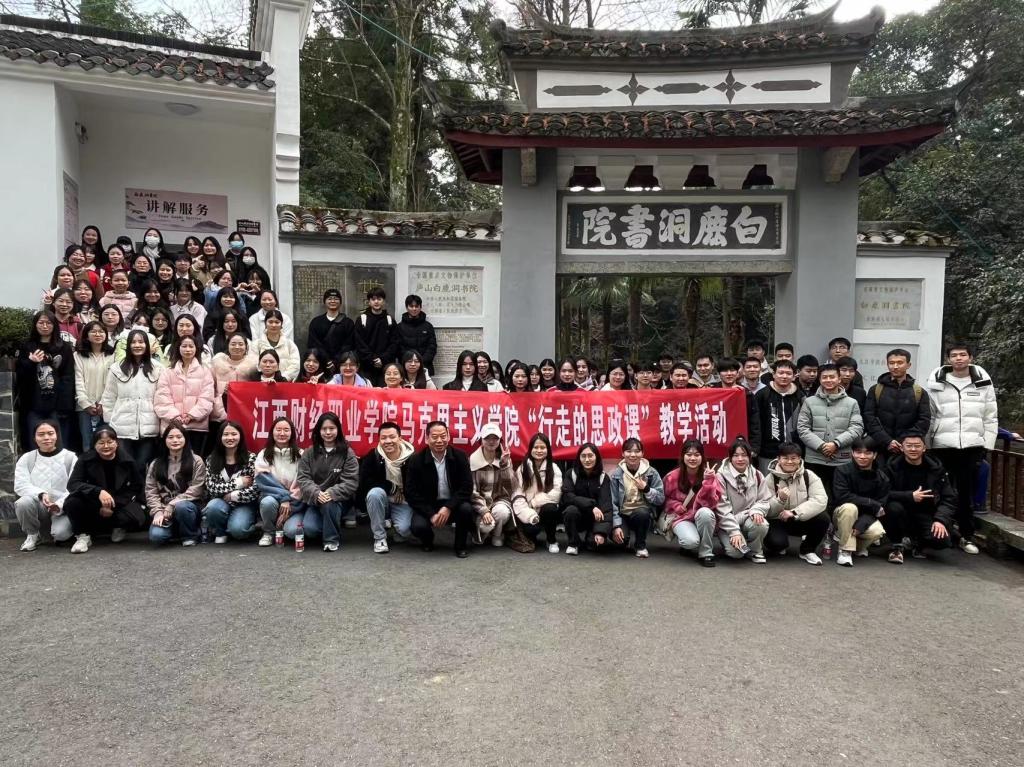 为认真贯彻江西省委教育工作领导小组《全国“大思政课”建设综合改革试验区江西省问题式专题化团队教学改革实施方案》,落实《beat365正版唯一入口必一思政课问题式专题化团队教学实施办法》,充分利用校内外资源,发挥思政大课堂育人合力,有效提升思政课的教学效果,12月14日,马克思主义学院组织2023级专本联培会计学专业学生前往家门口“大思政课”实践教学基地——庐山白鹿洞书院开展“认真学习贯彻习近平文化思想 建设中华民族现代文明”专题教学。教学由思政课老师朱欣成和文化学者、原白鹿洞书院管理委员会副主任郭宏达共同进行。