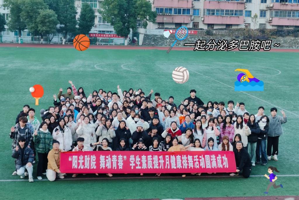 为丰富校园文化生活,提升学生综合素质,根据学校“学生素质提升月”活动计划,基础教育学院将体育与美育有机融合,于12月11日至12月30日面向全校学生开展“阳光财院 舞动青春”健康排舞活动,覆盖了八里湖校区和湖滨校区,有400多名学生参与,充分展现出财院学子的青春风采。此次活动由钟蕾、王莺两位老师指导。