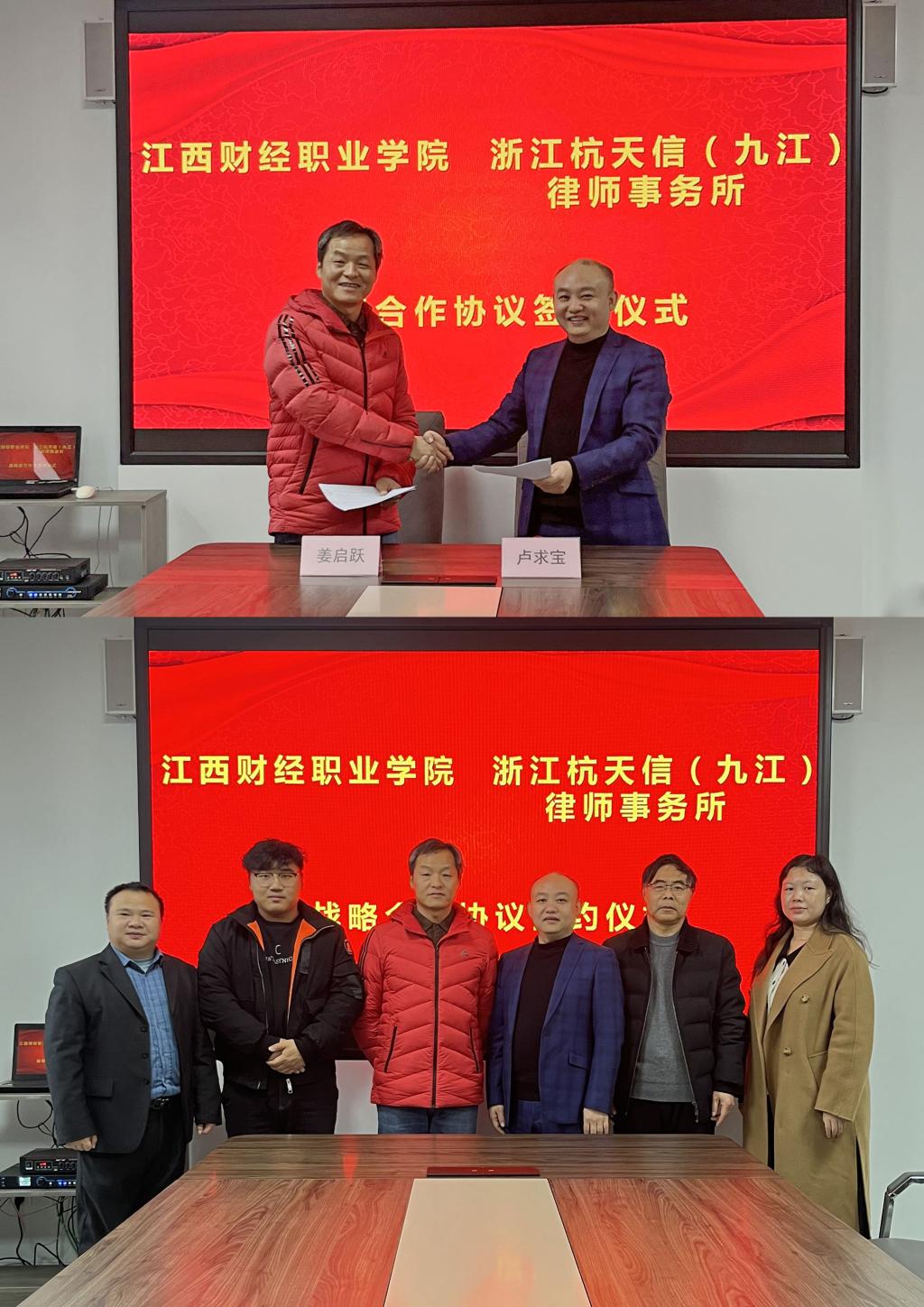 浙江杭天信(九江)律师事务所主任卢求宝介绍了律师事务所的基本情况,以浙江杭州总所为依托,以九江分所为平台,并表示愿意与现代服务学院建立长期合作关系,共同为基层培养更多法律人才。双方就律师进校讲学、学生实习就业等方面进行了深入交流。校企双方经过充分交流达成合作意向并签订了战略合作协议。