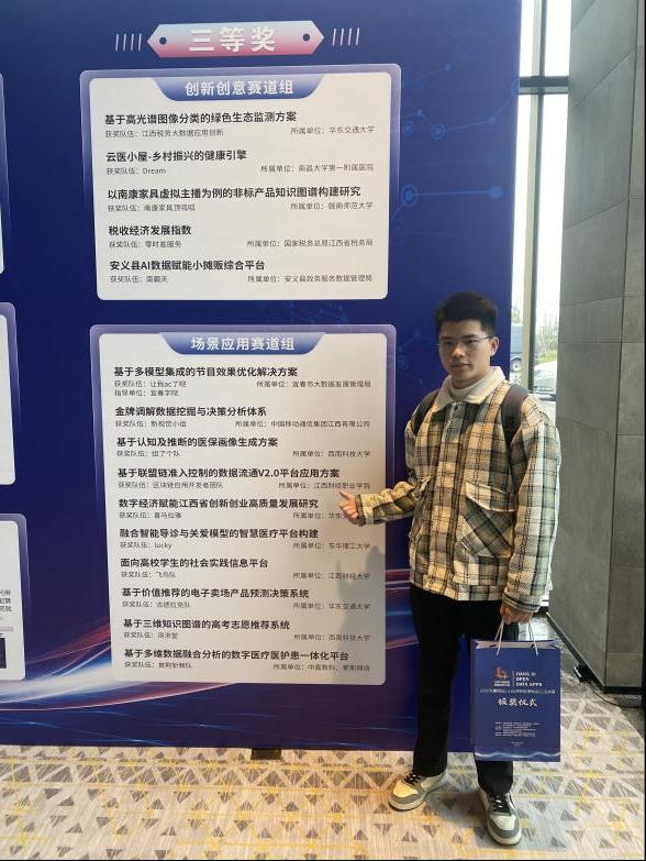 3月13日,2023(第四届)江西开放数据创新应用大赛在南昌举行颁奖仪式。由信息工程学院胡晓娥、彭健两位老师指导,谢胜利、舒阳辉2名同学组成的“区块链应用开发者团队”与诸多省内外高校和企事业单位同场竞技,最终荣获场景应用赛道三等奖,并获奖金3000元,是所有参赛队伍中唯一获奖的高职院校团队。