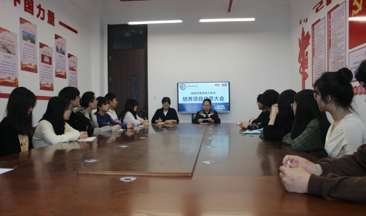 为积极响应教育部办公厅等五部门关于实施职业教育现场工程师专项培养计划的通知要求,推进省教育厅开展的省级职业教育现场工程师产业学院建设项目有效实施,以产业人才需求为导向、以提高学生技能水平为目标、高质量就业为目的,会计学院与用友网络科技有限公司校企联合实施“数智财务现场工程师”培育项目打造校企命运共同体,培养 “大国工匠”数智企业所需的会计信息系统实施与应用维护工程师一线岗位紧缺人才。4月2日下午4点10分,会计学院万凯院长及相关负责人于八里湖校区北区教学楼B308,面向即将深入企业现场开展实习活动的“数智财务现场工程师”学员班,召开了用友“数智财务现场工程师”培训现场教学实践项目动员大会。