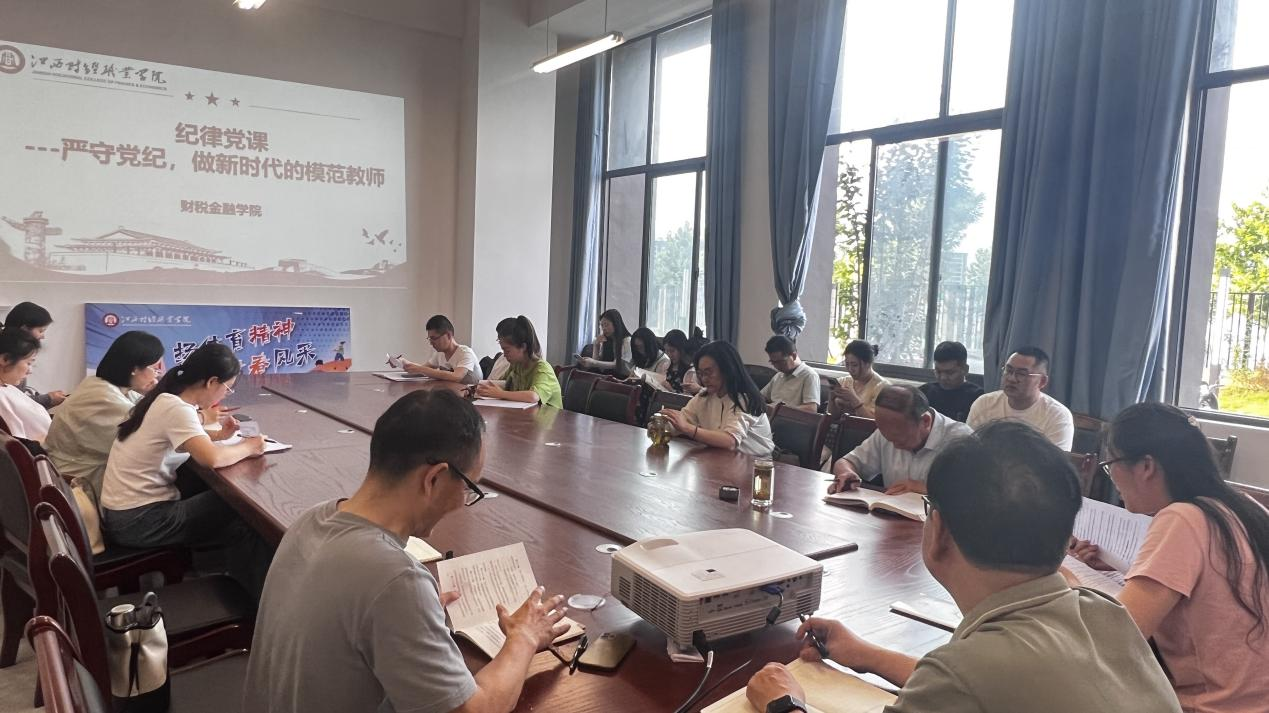 6月11日下午,财税金融学院在八里湖校区洙泗学馆B101会议室举办了一场主题为“严守党纪,做新时代的模范教师”的党纪学习教育专题党课。此次党课由学院党总支副书记王怡然主讲,全体教职工参加学习。