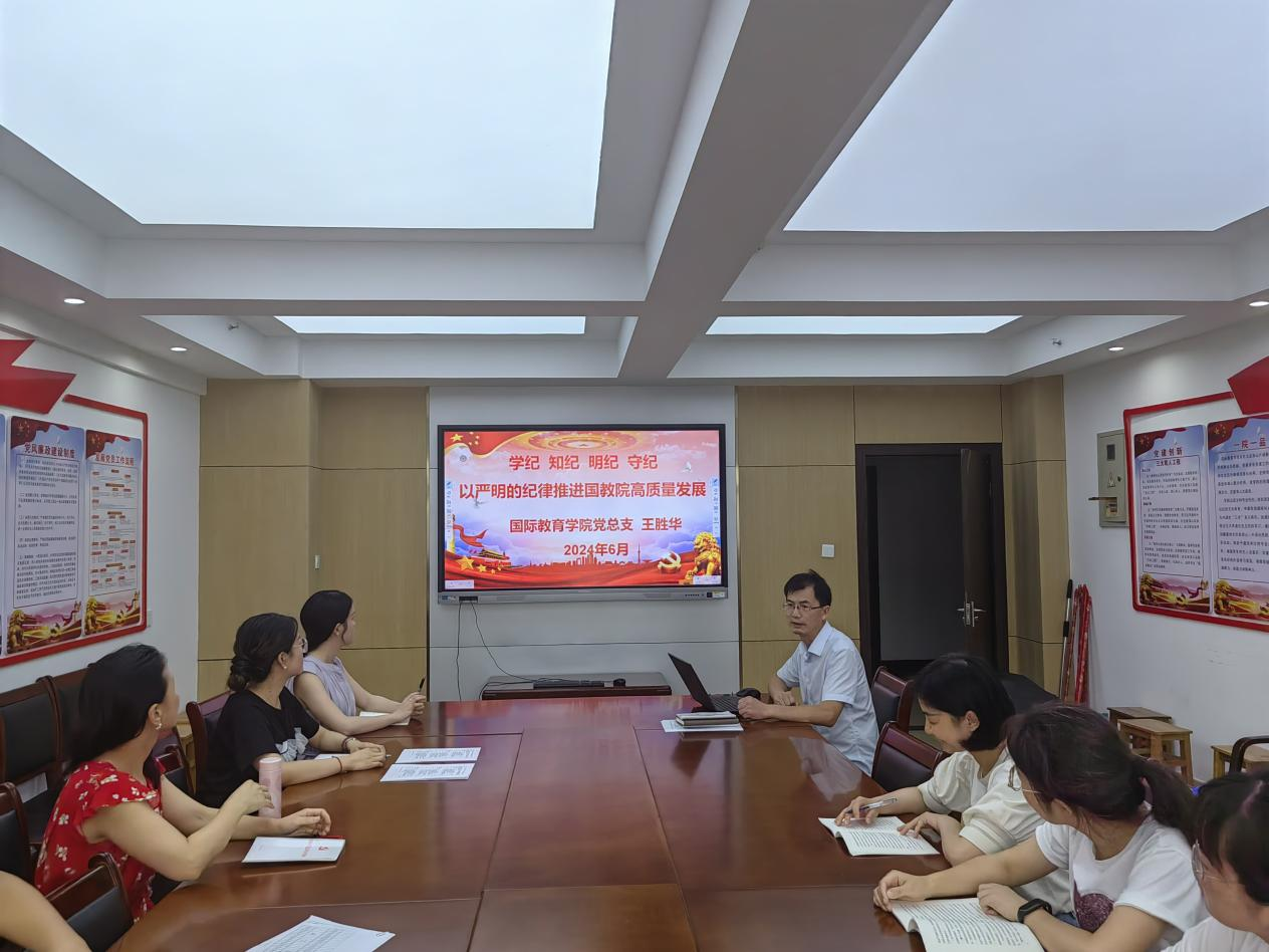 为扎实推进党纪学习教育,进一步加强全体党员对党纪国法的认识和理解,提高党性修养,增强纪律意识,6月18日,国际教育学院在浔阳校区综合楼918室开展了以《学纪 知纪 明纪 守纪 以严明的纪律推进国教院高质量发展》为主题的党纪学习教育专题党课,此次党课由党总支书记王胜华教授主讲,全院党员聆听了党课。