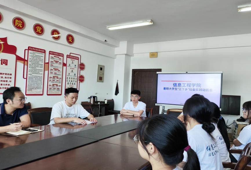 为深入学习贯彻习近平新时代中国特色社会主义思想,深化青年大学生的社会实践教育,引导和帮助青年学生在社会实践大课堂中受教育、长才干、作贡献,引领学生立志做有理想、敢担当、能吃苦、肯奋斗的新时代好青年。信息工程学院于2024年7月5日在综合楼813会议室开展2024年大学生暑期“三下乡”社会实践动员会。信息工程学院党总支书记韦应珠、团队指导老师彭刚、杨凯老师及实践队全体成员参会。