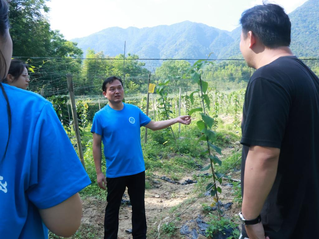 图为:“浔梦杨洲”社会实践队与罗汉果老板在种植基地实地考察,了解罗汉果的生长、作用和销售情况。