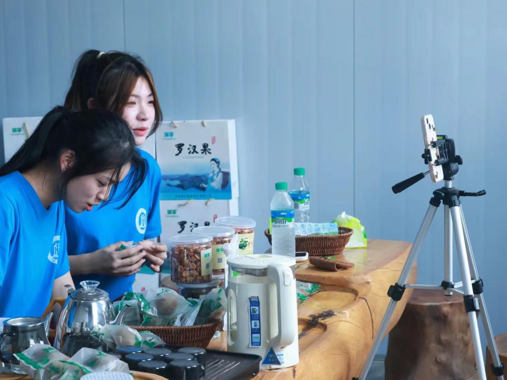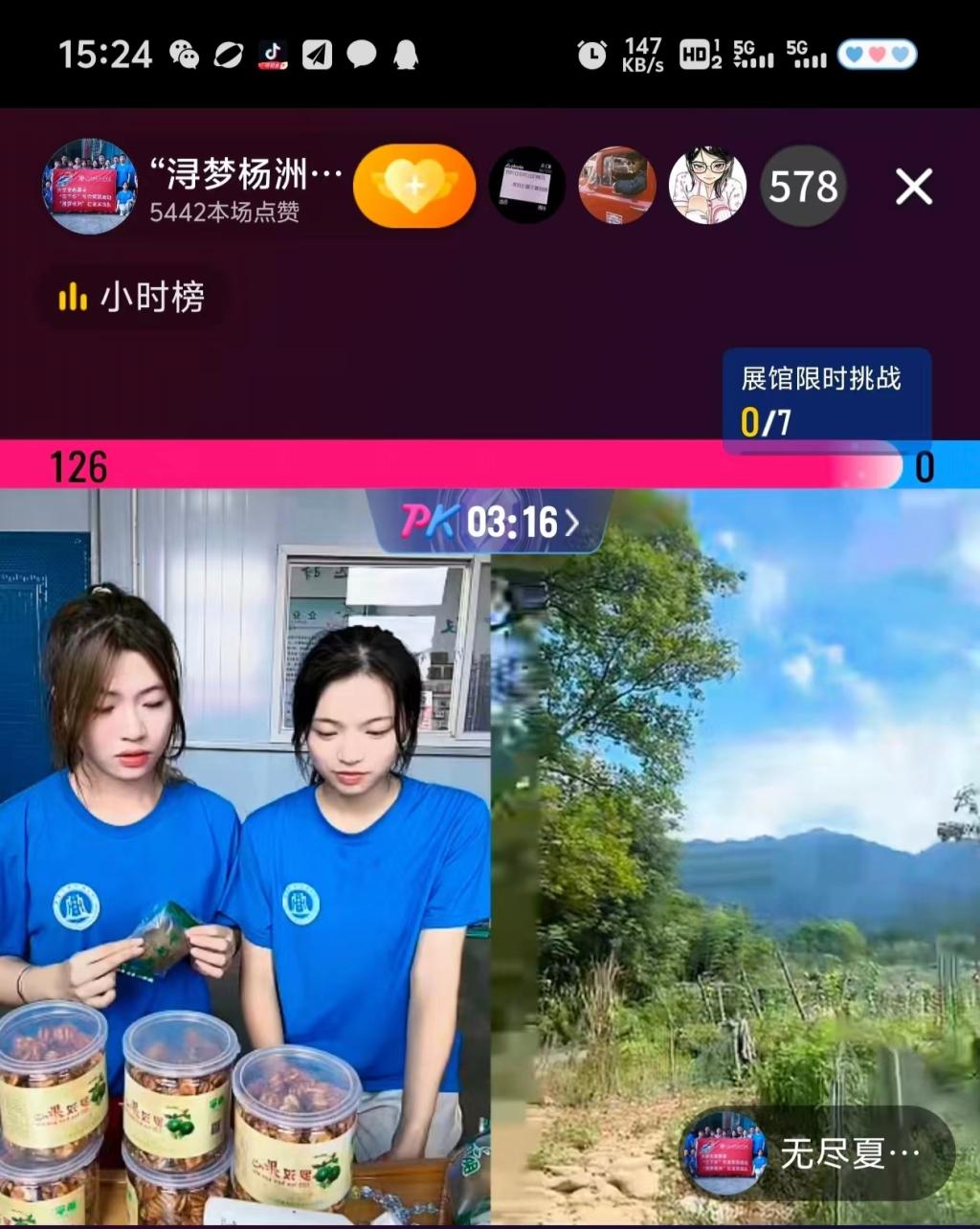 图为:“浔梦杨洲”社会实践队在工厂与种植基地直播连线。
