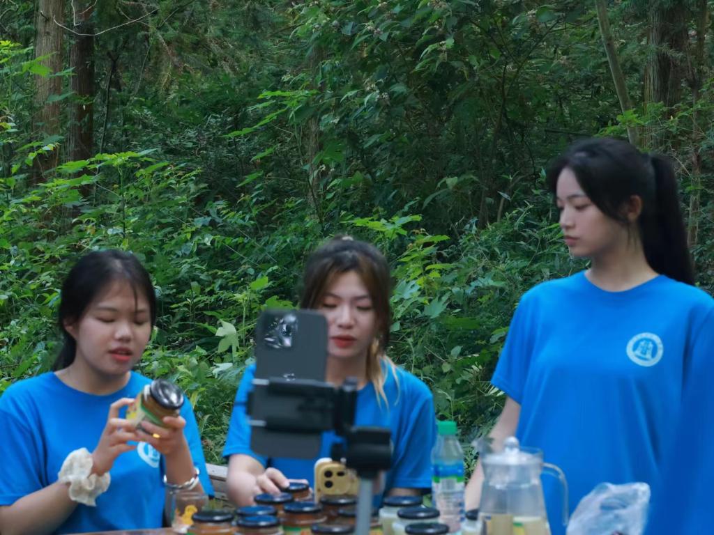 图为:“浔梦杨洲”社会实践队队员在山上养蜂基地介绍蜂蜜品种品质。