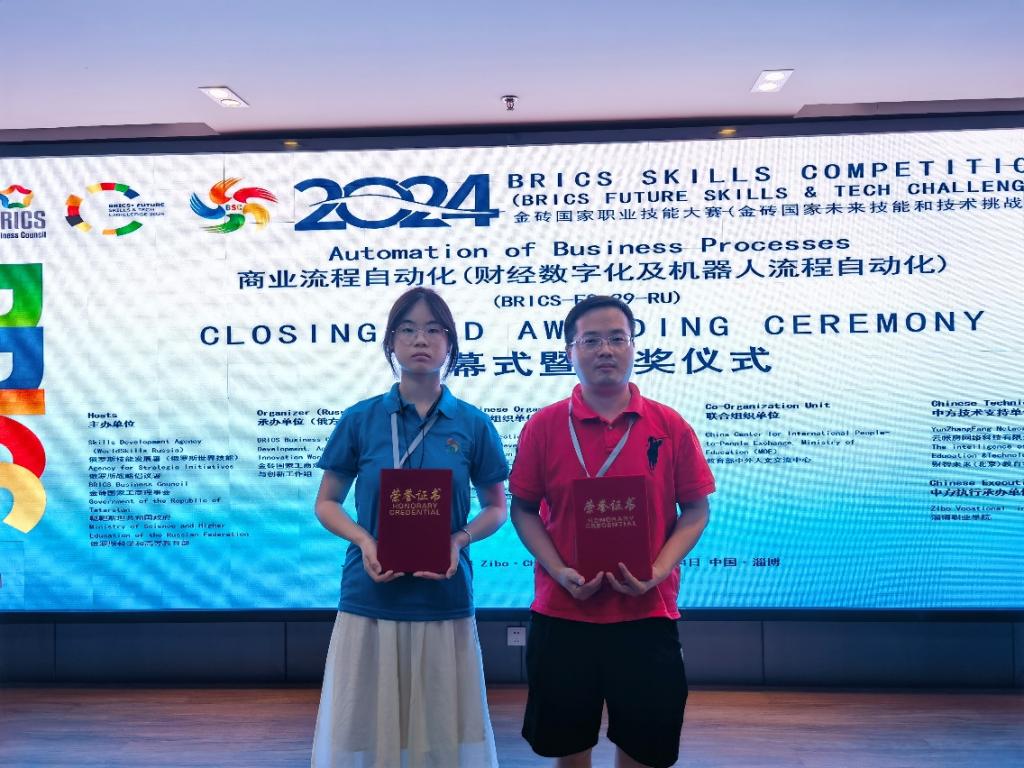 此次大赛由俄罗斯技能发展署(俄罗斯世界技能)、俄罗斯战略倡议署、金砖国家工商理事会、鞑靼斯坦共和国政府、俄罗斯科学和高等教育部主办;金砖国家工商理事会(中方)技能发展工作组、“一带一路”暨金砖国家技能发展国际联盟、教育部中外人文交流中心作为中方协办单位。经过各省级区域选拔赛,大赛共有来自本科、高职院校的师生68名选手进入国内决赛。beat365官网会计学院22级大数据与会计10班戴思怡同学在此次比赛中表现出色,以第四名的成绩荣获一等奖,席伟明荣获“优秀指导教师”称号。