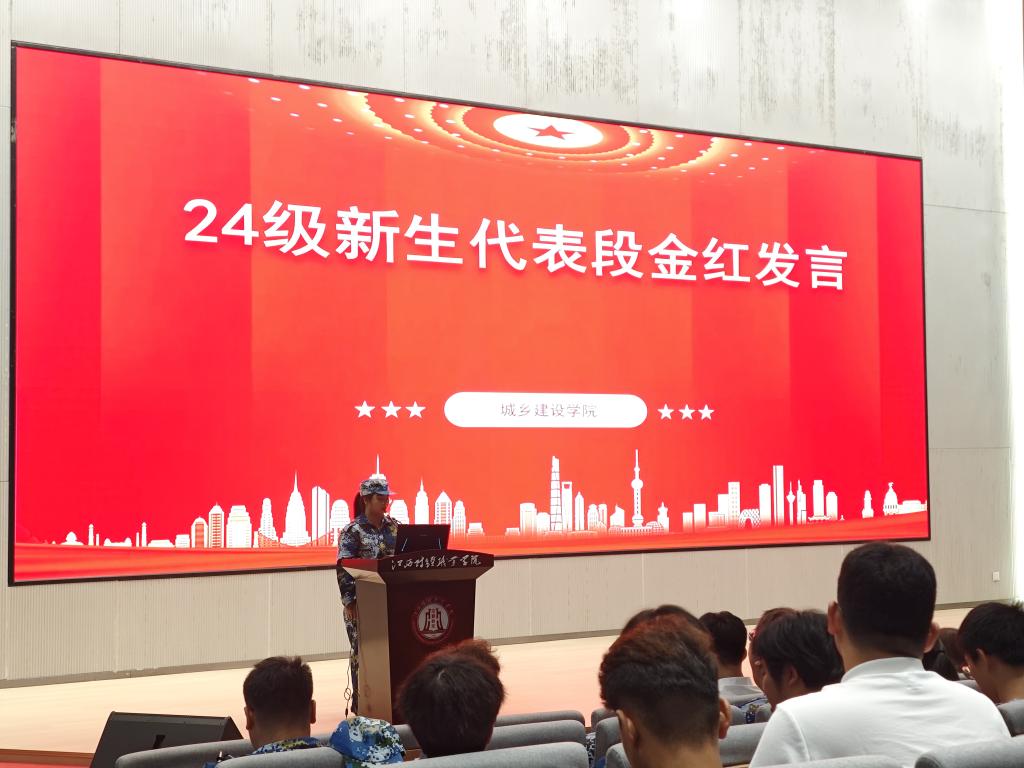 接下来,新生代表24工程造价3班段金红和老生代表23工程造价1班陈鑫源分别上台发言,号召全体新生能够珍惜光阴,勤奋好学,在新起点上以饱满的热情谱写新的篇章。