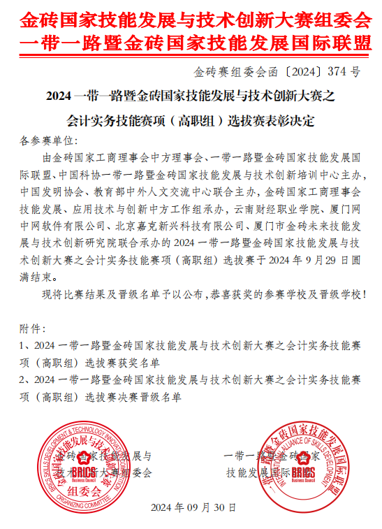 2024年9月29日,由金砖国家工商理事会、金砖国家技能发展国际联盟主办,教育部中外人文交流中心、中国发明协会联合主办,厦门网中网软件有限公司技术支持的“2024年金砖国家技能发展与技术创新大赛之会计实务技能全国选拔赛”在线上成功落幕。当天来自全国的660多支高职队伍参加了云端赛事,经过一天紧张激烈的比赛,由beat365官网会计学院余晖文、黄玲老师指导,叶尔芳、刘厚松、宋悦和张奥同学组成的代表队荣获团体一等奖第1名的优异成绩,吴玟、杨子璇、徐月蓉、黄榕组成的代表队荣获一等奖第4名,两位教师荣获“优秀指导教师”称号。