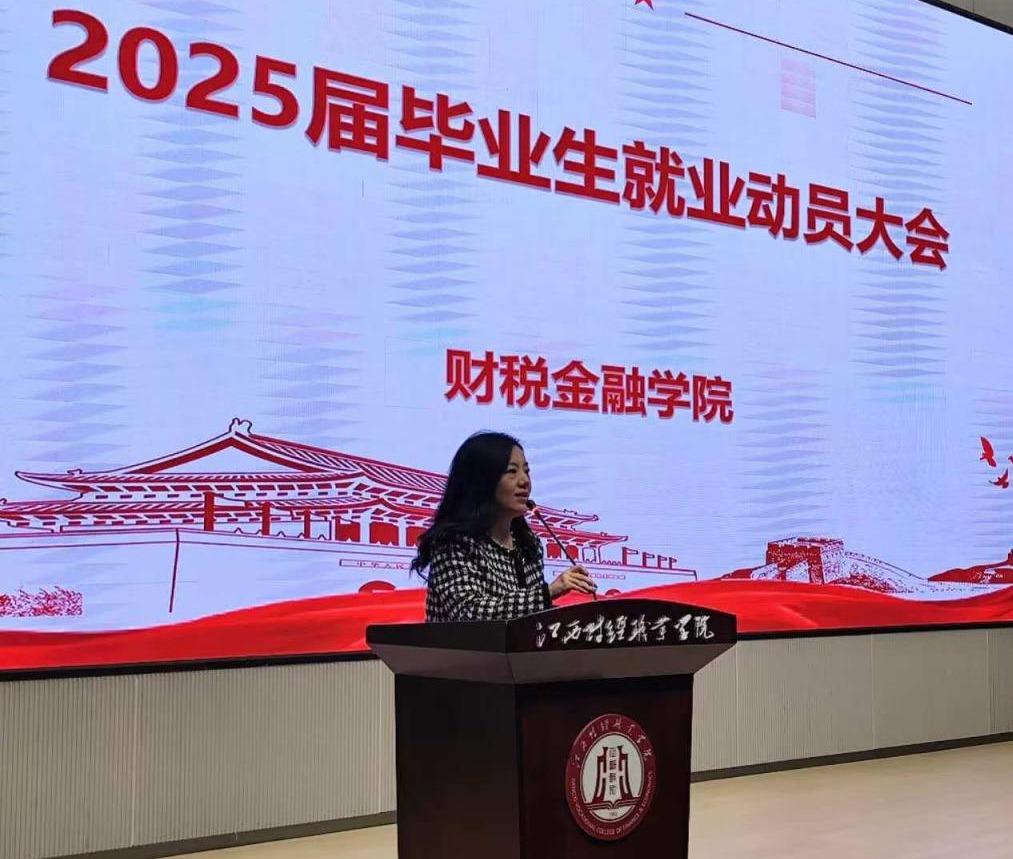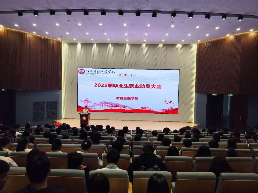 为帮助2025届毕业生了解就业形势、抓住就业机遇、增强就业意识、树立正确的就业观与择业观,10月29日下午,财税金融学院在八里湖校区行政楼第一报告厅举行2025届毕业生就业动员大会。财税金融学院党总支副书记王能翔、副院长周莉,毕业班班主任以及2025届毕业生参加了动员大会。大会由党政办公室主任黄晖雅主持。