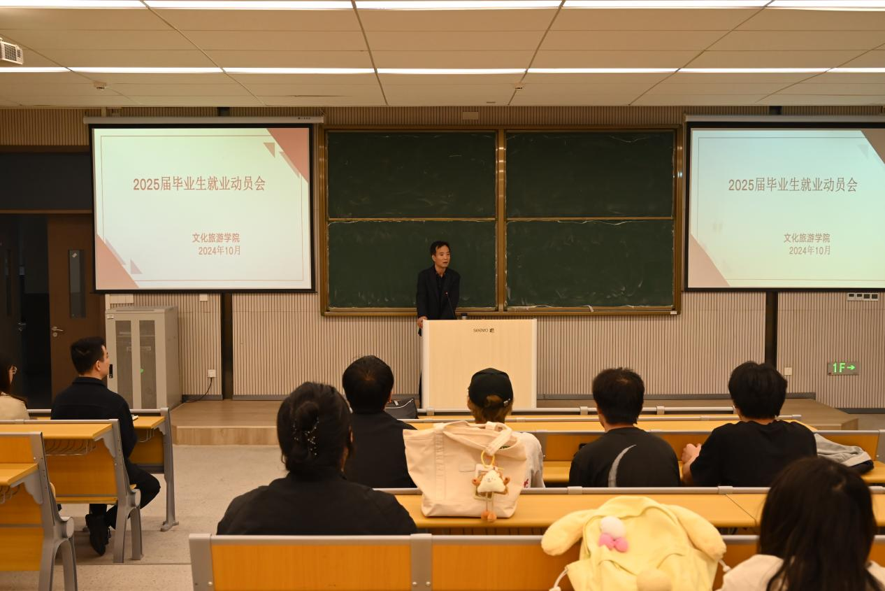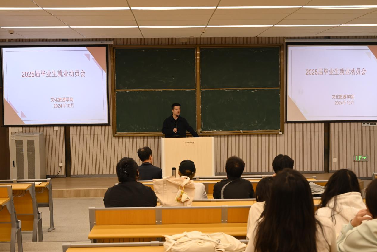 为帮助即将毕业的学子们更好地规划职业生涯,提升就业竞争力,10月30日下午,文化旅游学院在八里湖新校区二教D112教室举办了2025届毕业生就业动员会。动员会由文化旅游学院党总支副书记熊韬主持,文化旅游学院党总支书记宋自奋、全体2025届毕业生及毕业班班主任参加大会。