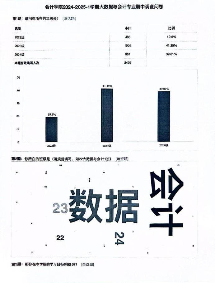 本次期中教学检查继续沿用了调查问卷形式,对会计学院不同年级、不同专业学生校园生活、专业学习、就业规划等全方位进行摸底式调查,并对调查结果创新型采用PowerBI等数据可视化软件进行了大数据样本分析,以柱状图、词云等直观形式展现学生提出的各项问题,科学化地进行问题归类,突出重要性层级,为期中教学座谈会的开展提供了问题反馈参考价值。