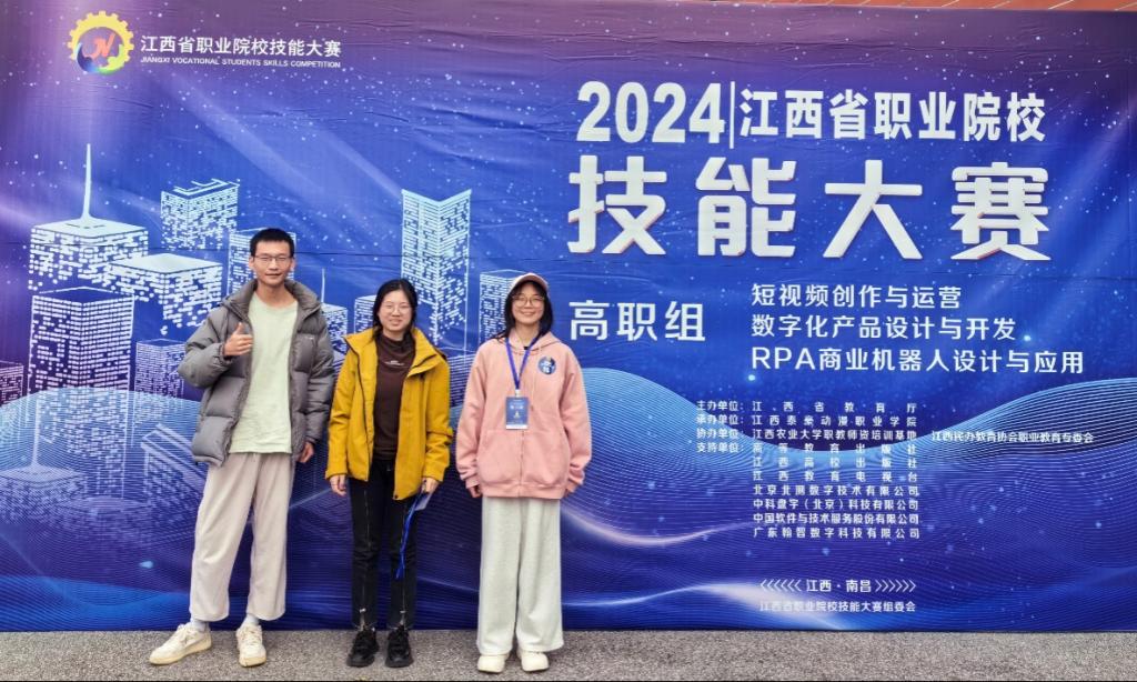 近日,2024年省职业院校技能大赛高职组“数字化产品设计与开发”赛项在江西泰豪动漫职业学院成功举办。全省共计28所职业院校参加此次大赛,经过紧张而激烈的角逐,由beat365官网信息工程学院冷晨曦、姜蕴莉老师指导的黄屹扬、刘明燕、陈海燕同学获得该赛项一等奖。