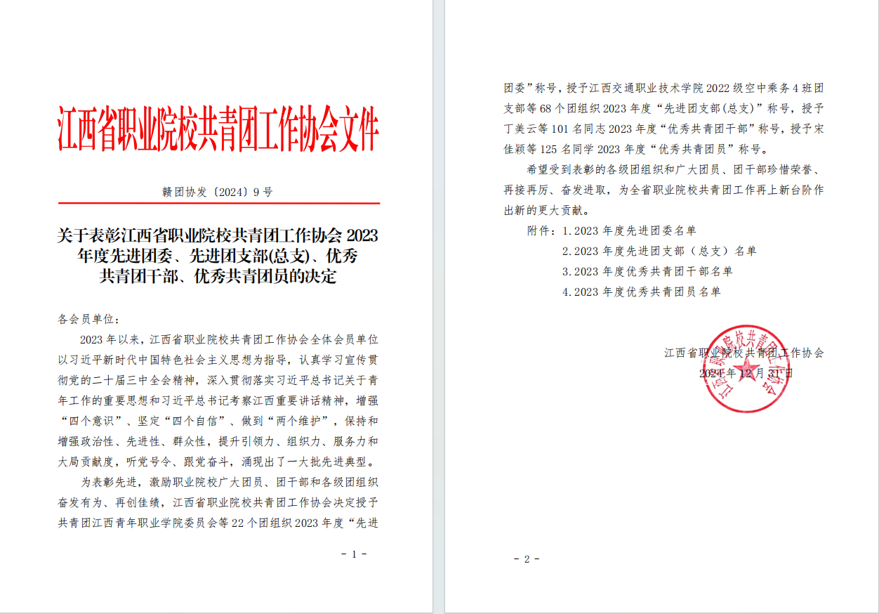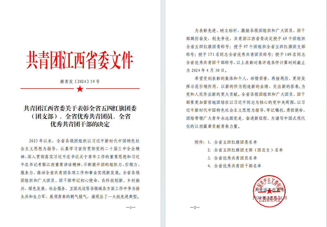 近日,共青团江西省委、江西省职业院校共青团工作协会印发了《共青团江西省委关于表彰全省五四红旗团委(团支部)、全省优秀共青团员、全省优秀共青团干部的决定》《关于表彰江西省职业院校共青团工作协会2023年度先进团委、先进团支部(总支)、优秀共青团干部、优秀共青团员的决定》。