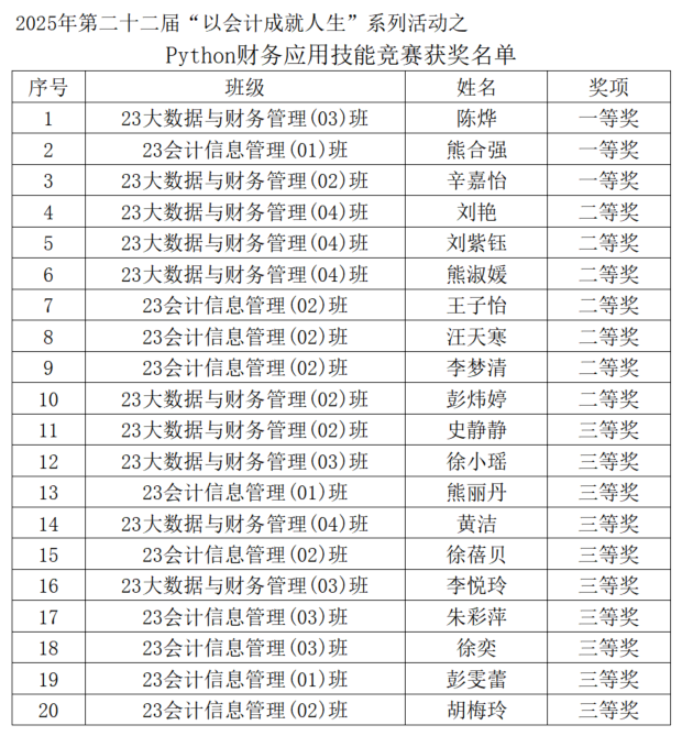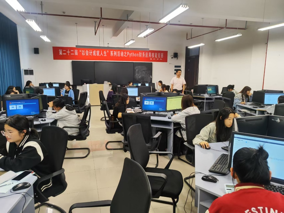 为深化数字化人才培养,推动前沿技术与财务实践的融合,会计学院于2025年4月17日下午,在八里湖校区一号教学楼332教室成功举办了第二十二届“以会计成就人生”系列活动之Python财务应用技能竞赛,来自23级财务管理、会计信息管理专业班级的同学参加了此次竞赛活动,展开了一场专业与技术的交锋。