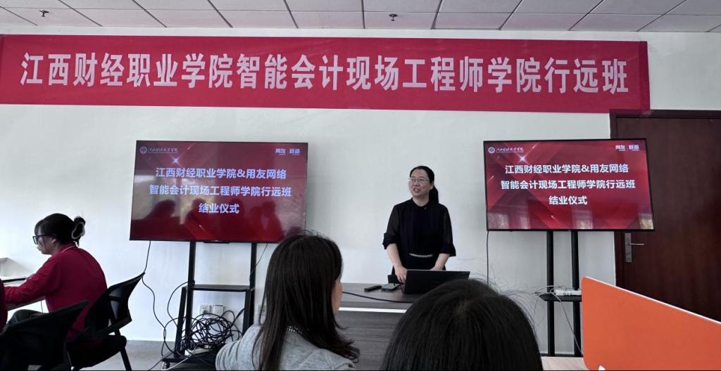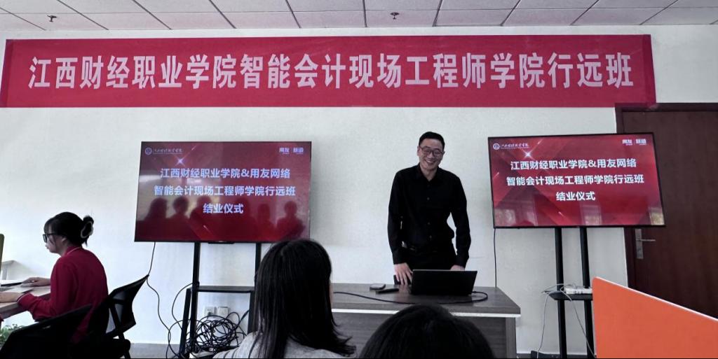 万凯院长在总结发言中回顾了“行远班”的建设历程。他表示,作为江西省首批现场工程师培养项目,“行远班”依托“学生—学徒—员工”三位一体培养模式,通过“岗课赛证”融通路径,将用友YonSuite产品架构、业财一体化解决方案等核心课程融入教学,学员在高强度实践中完成了150余个真实企业项目任务,并全员通过用友远程交付助理工程师认证及数智化管理师(财务会计)考核,展现了校企协同育人的显著成效。未来学院将进一步优化“双导师制”,推动校企联动培育智能会计工程师,为区域经济输送更多精技术、善协作的智能会计人才。
