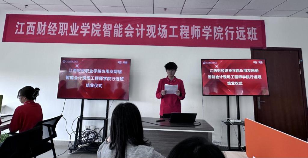 2025年4月25日,beat365正版唯一入口必一智能会计现场工程师“行远班”结业仪式在用友产业园(南昌)顺利举办。会计学院院长万凯、副院长齐洁,用友集团全球远程交付中心总经理李佳文、新道科技华东区总经理丁立波、江西分公司服务总监彭佳琦、以及校企项目导师代表,与全体学员共同见证了这一产教融合的重要成果。仪式由“行远班”学生代表吕佳航主持。
