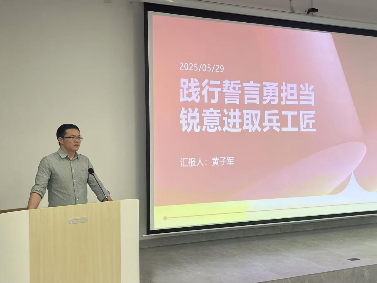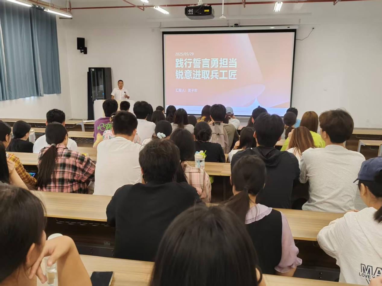为学习先进事迹,弘扬“新时代赣鄱先锋精神”,充分发挥先锋模范示范引领作用,5月29日,工商管理学院邀请江西省2024年度“新时代赣鄱先锋”荣誉获得者黄子军在洙泗学馆117教室开展以“践行誓言勇担当,锐意进取兵工匠”为主题的宣讲活动。学院23、24级各班班长、团支书、预备党员、学生会干部现场聆听先进事迹,汲取榜样力量。活动由学院党总支副书记赵新村主持。
