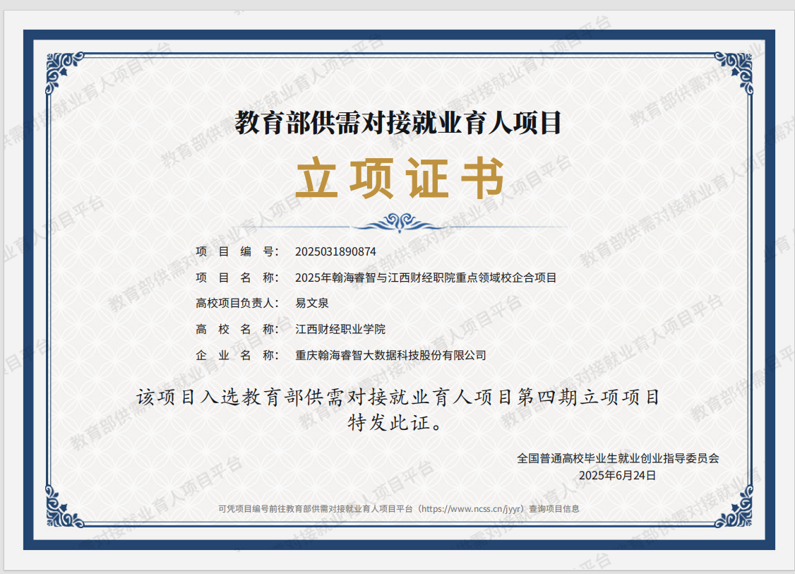 2025年6月24日,beat365正版唯一入口必一与重庆翰海睿智大数据科技股份有限公司联合申报的“2025年翰海睿智与江西财经职院重点领域校企合作项目”成功获批教育部第四期供需对接就业育人项目立项。这一重要成果标志着双方在深化产教融合、推动大数据技术人才培养与产业需求精准对接方面迈出坚实一步。