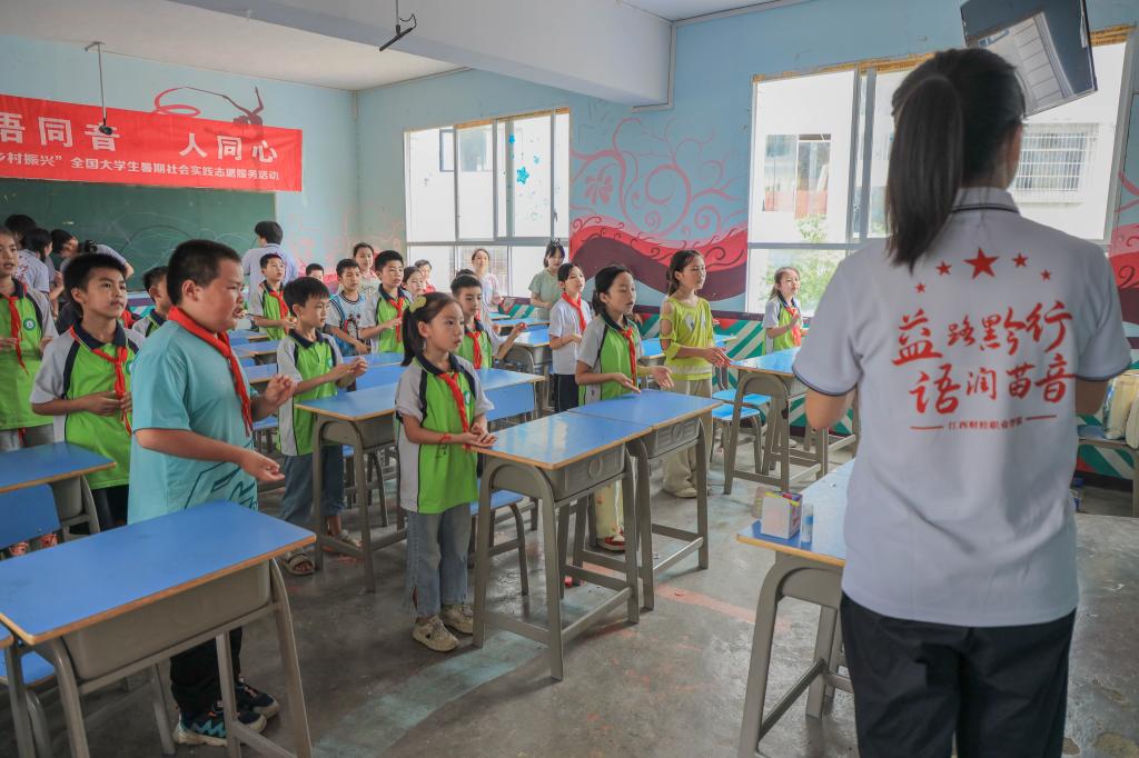 “我们是共产主义接班人,继承革命先辈的光荣传统……”稚嫩而又坚定的歌声在舟溪小学校园里回荡。实践队员们与孩子们一同唱响《我们是共产主义接班人》《歌唱祖国》等经典红歌,队员们逐句教唱,耐心纠正孩子们的发音,在激昂的旋律中,孩子们不仅提升了普通话的发音水平,更在歌声里抒发了对祖国的热爱之情,让红色的旋律在心中久久萦绕。